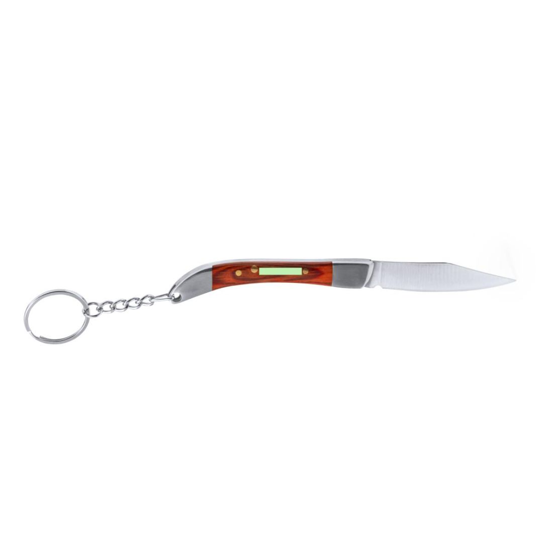 Práctico llavero navaja con hoja de acero inox y resistente empuñadura metálica con detalles en madera natural. Presentado en caja de diseño kraft.