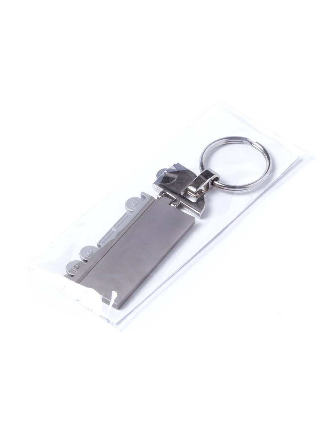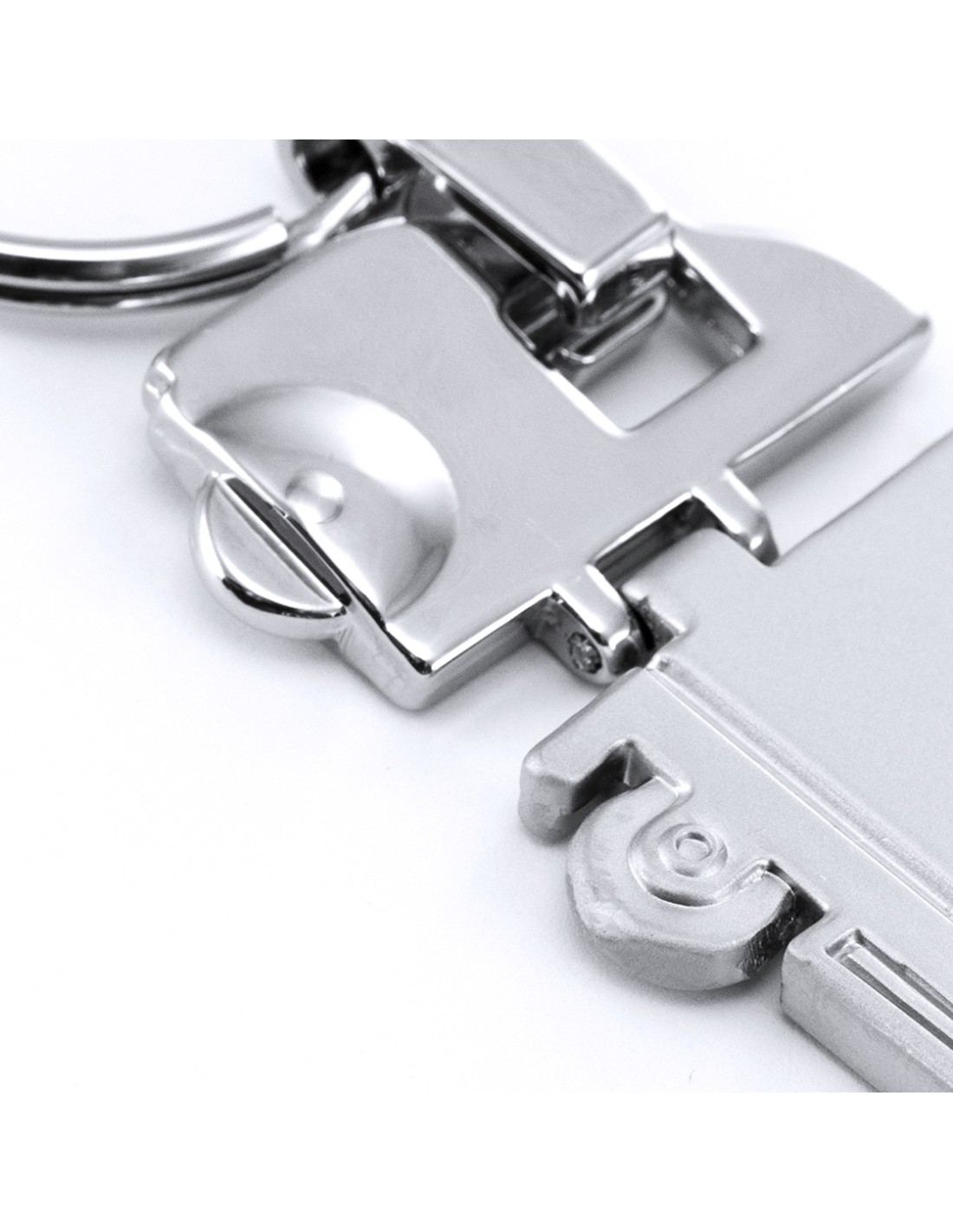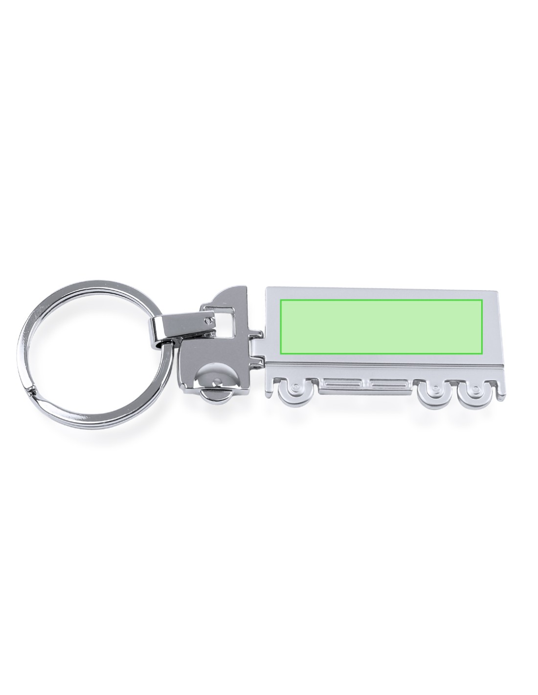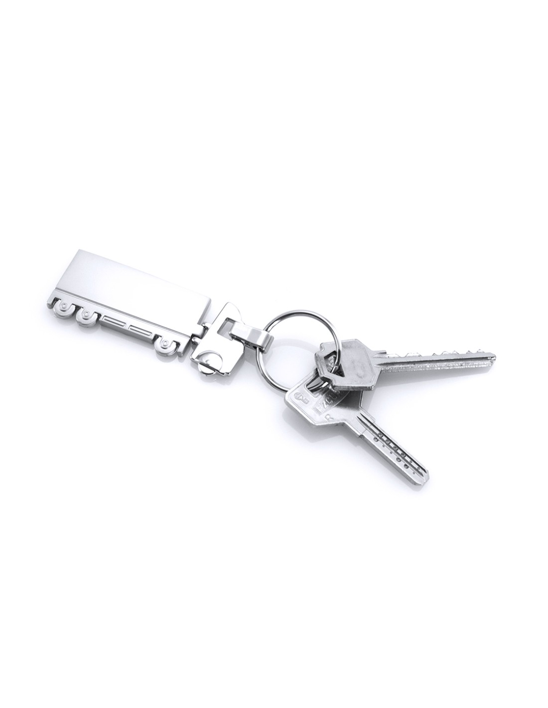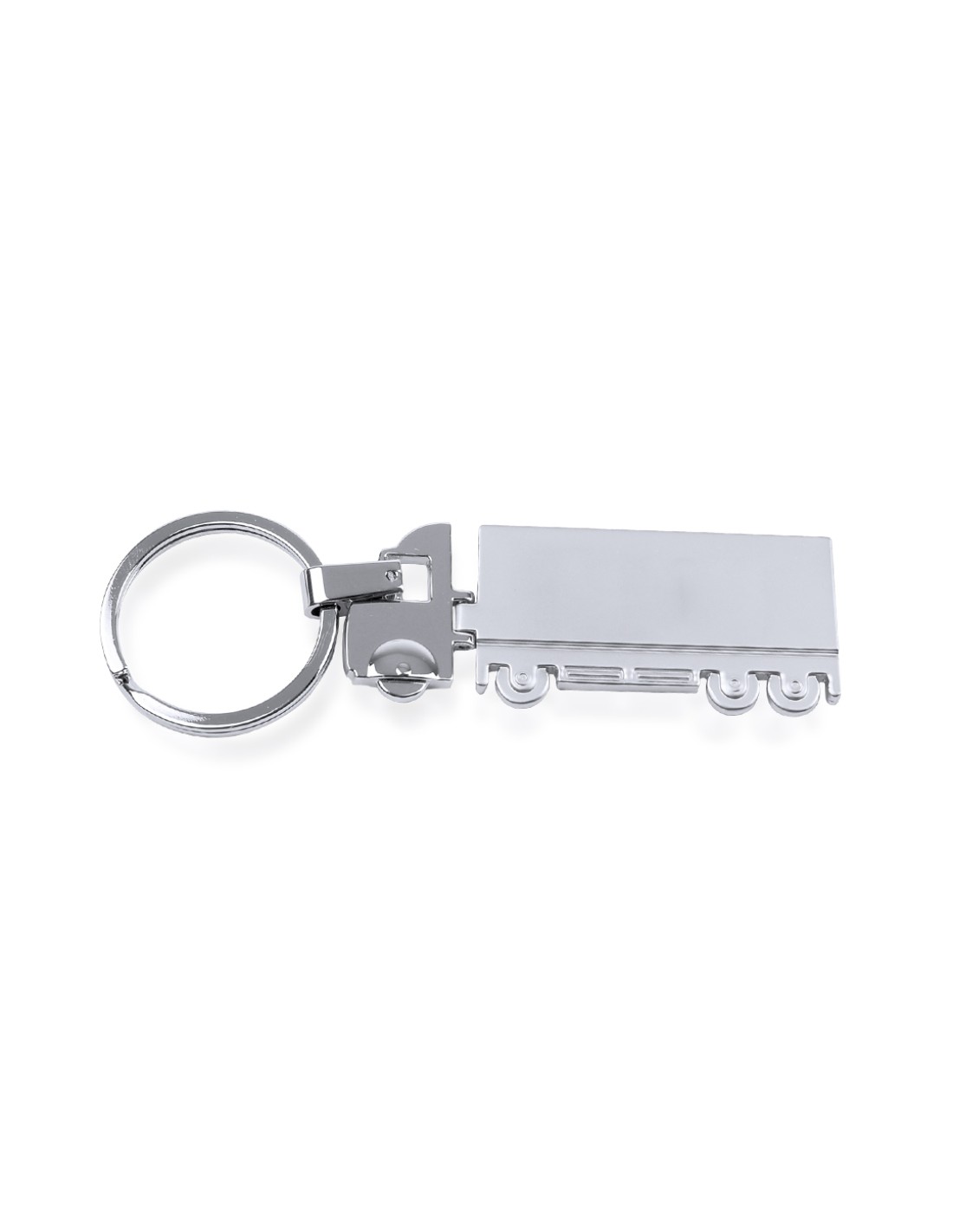 Llavero metálico en divertido diseño de camión especialmente diseñado para marcaje en láser. Con cabina en acabado brillo y remolque en acabado mate.