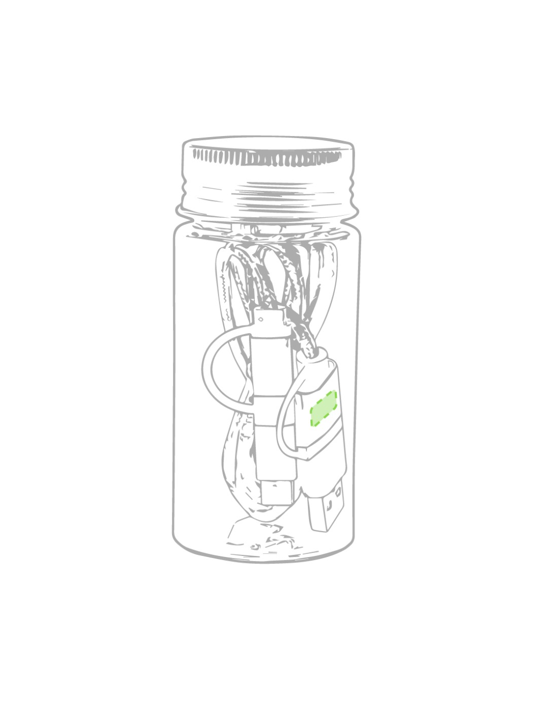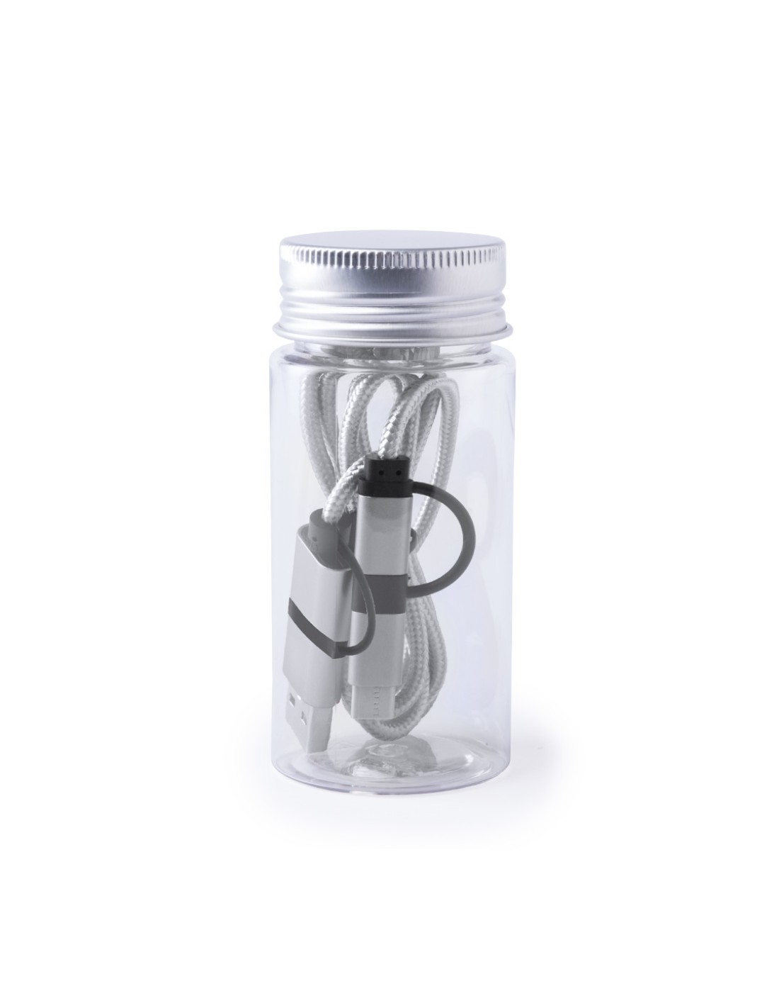 Cable cargador con conexión dual micro USB/Lightning y tipo C (entrada y salida). De 100cm de longitud, con conectores de aluminio y especialmente diseñado para marcaje en láser. Presentado en atractivo bote transparente con tapa a rosca.