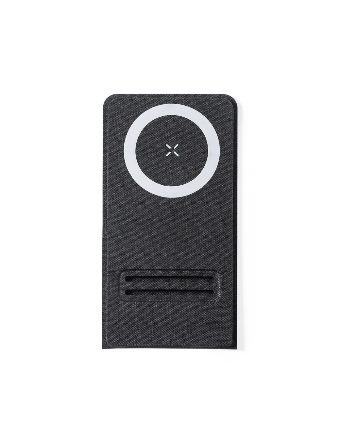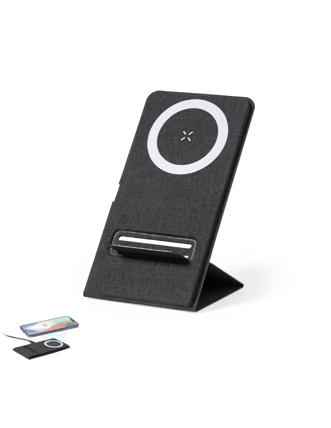 Cargador inalámbrico 15W. Fabricado en resistente poliéster 300D y con fijación magnética para poder usar el dispositivo mientras se produce la carga del mismo e incluyendo anillo adhesivo. Válido para todos los dispositivos con tecnología Magsafe y Qi. Plegado de pequeño tamaño para fácil transporte y presentado en atractiva caja individual de diseño.