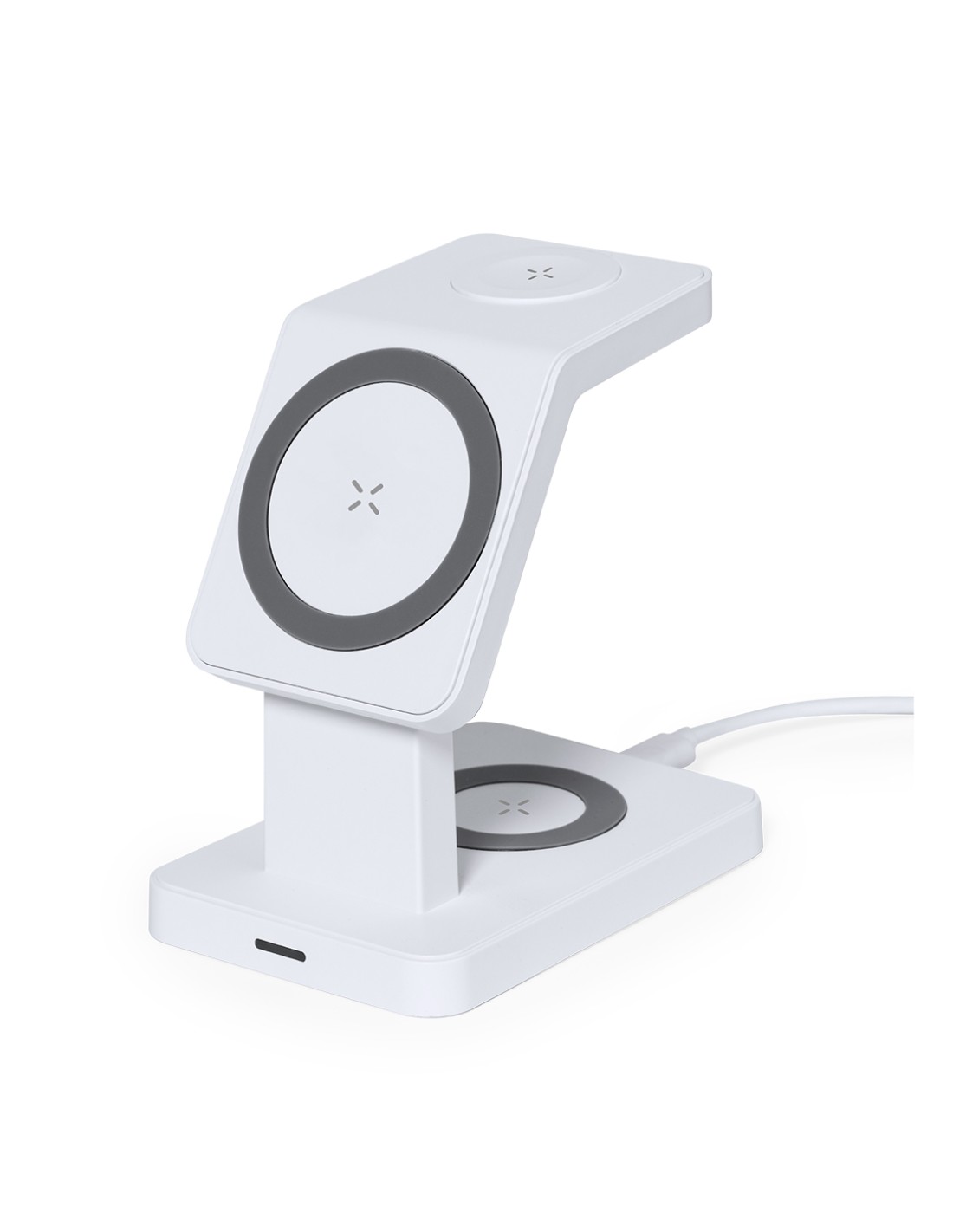Completo multicargador inalámbrico 15W con soporte para gadgets. Diseñado para la carga simultánea del smartphone, auriculares y smartwatch: una estación de carga todo en uno. Presentado en caja de diseño kraft. Disponible manual de instrucciones en español e inglés.
