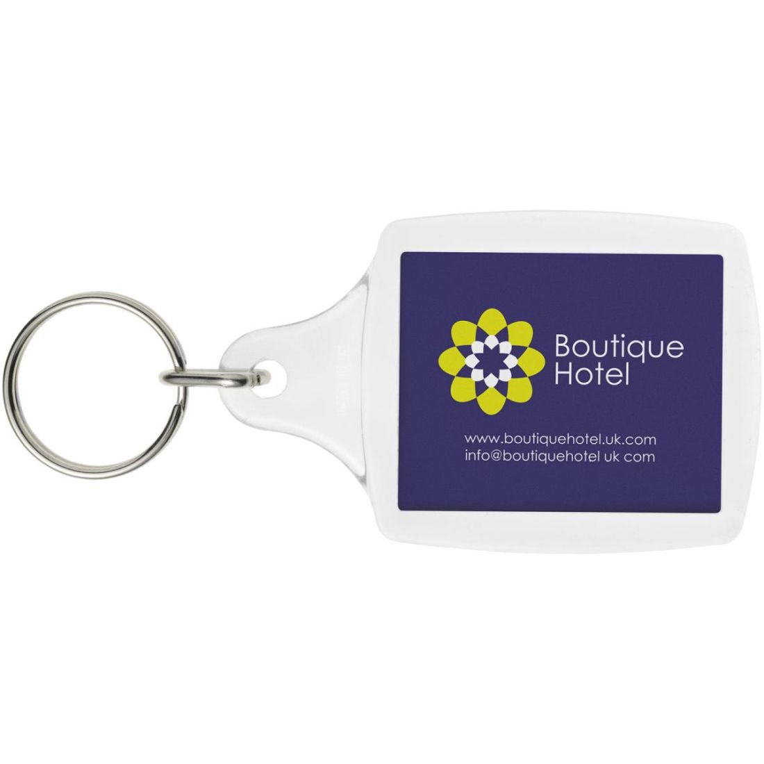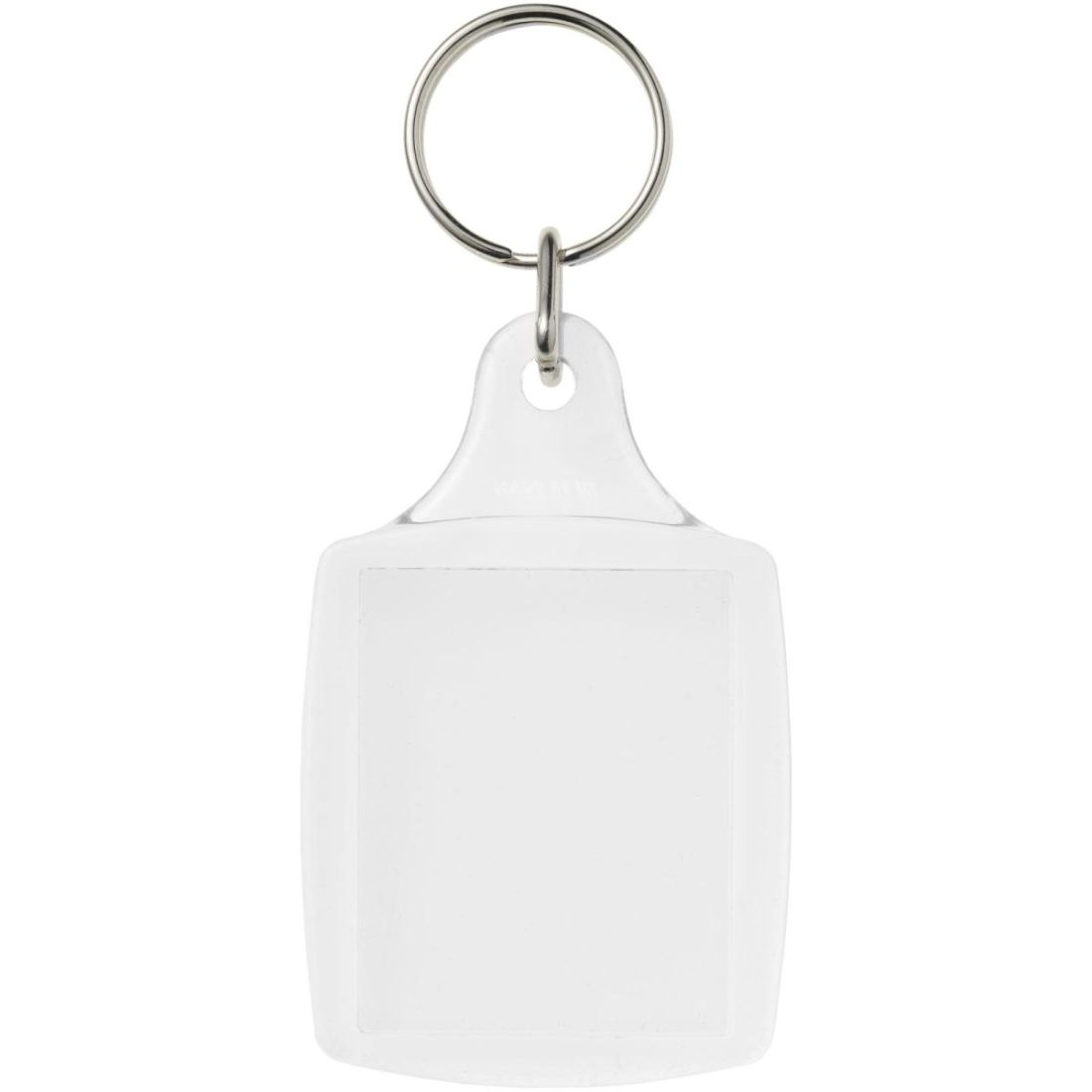Llavero transparente A5 con anilla abierta de metal. Diseñado para incluir un encarte de papel o una foto de pasaporte extraíbles. Dimensiones del encarte impreso: 4,5 x 3,5 cm.
