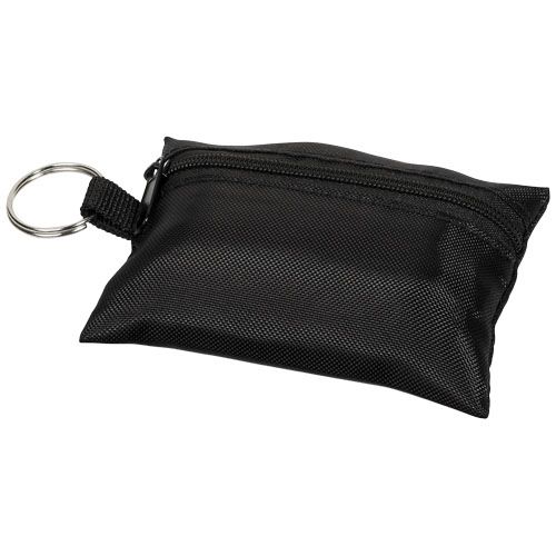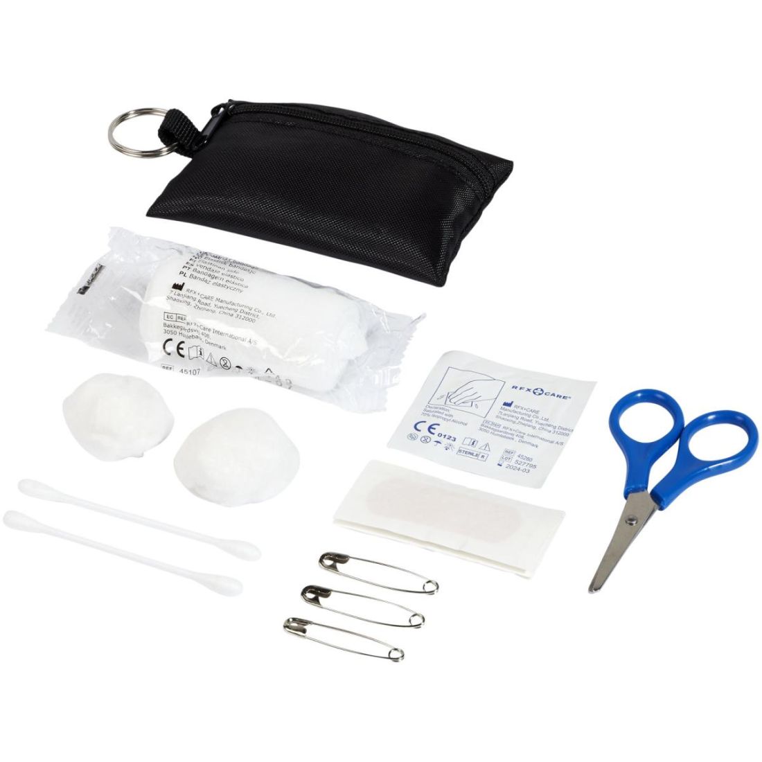 Práctica funda de poliéster con llavero que contiene 16 elementos de primeros auxilios. El kit contiene un par de tijeras (9 cm), 2 toallitas limpiadoras , 1 venda elástica (4 metros x 6 cm), 2 bolas de algodón (0,5 g), 3 imperdibles (3,6 cm), 5 tiritas (45x19 mm) y 2 bastoncillos (8 cm). Ideal para viajes, festivales, eventos y otras actividades al aire libre. Además, cuenta con una amplia zona de decoración. Un botiquín de primeros auxilios se considera un producto sanitario y se rige por la Directiva 93/42/CEE, en función del uso previsto: «Diagnóstico, prevención, control, tratamiento o alivio de enfermedades». Este dispositivo médico es de Clase I.