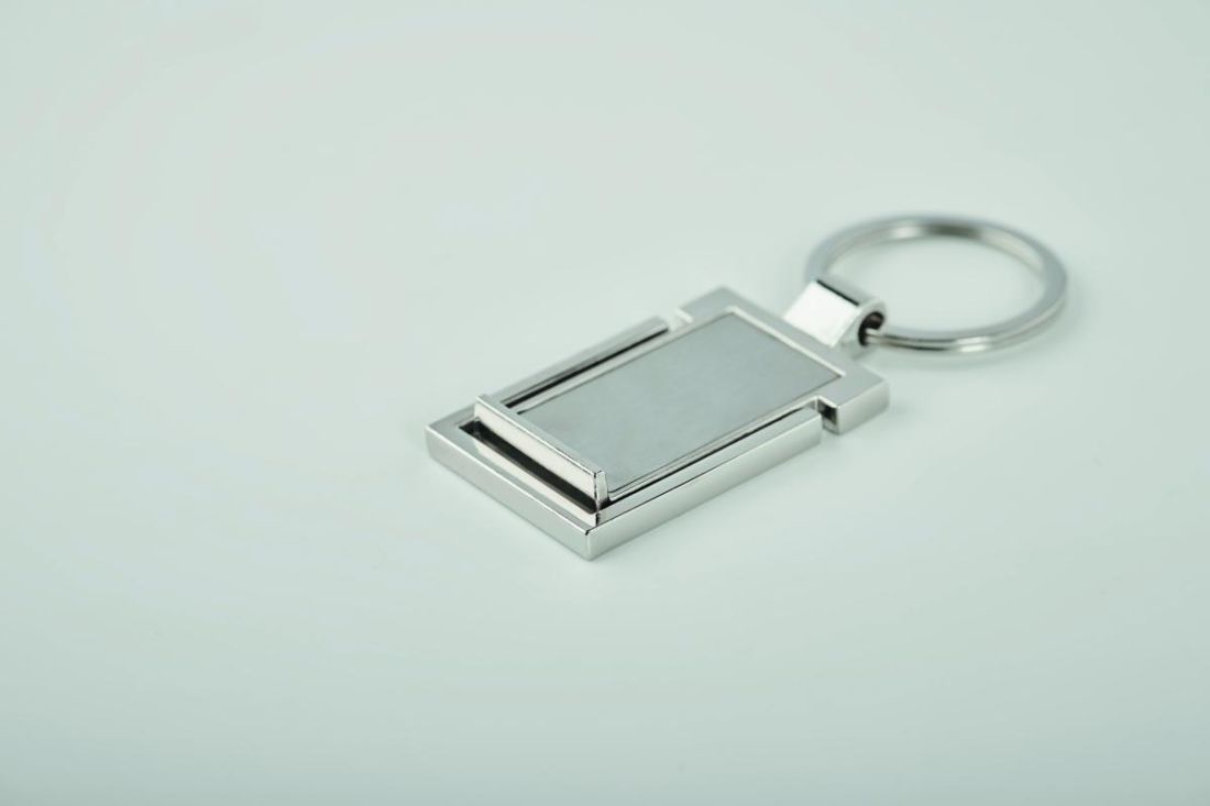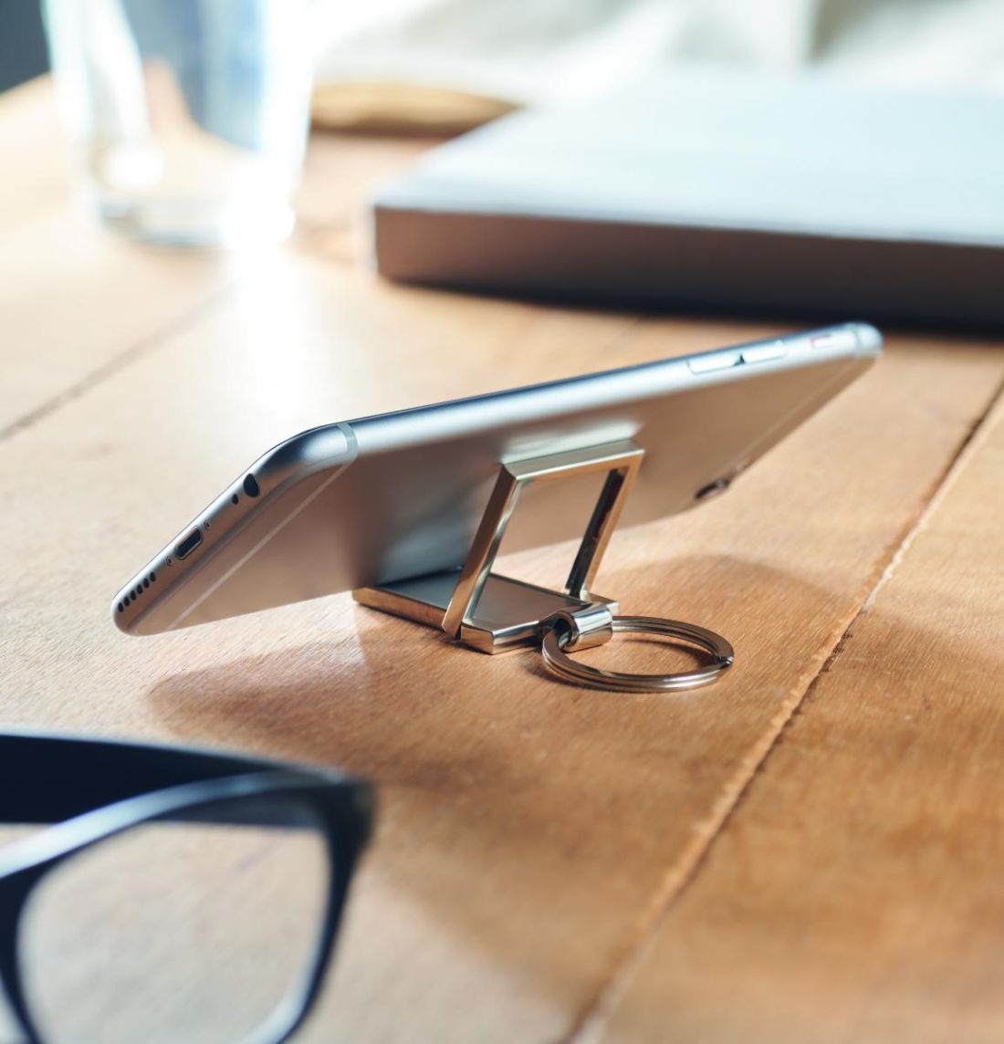 Llavero metálico con soporte para teléfono.