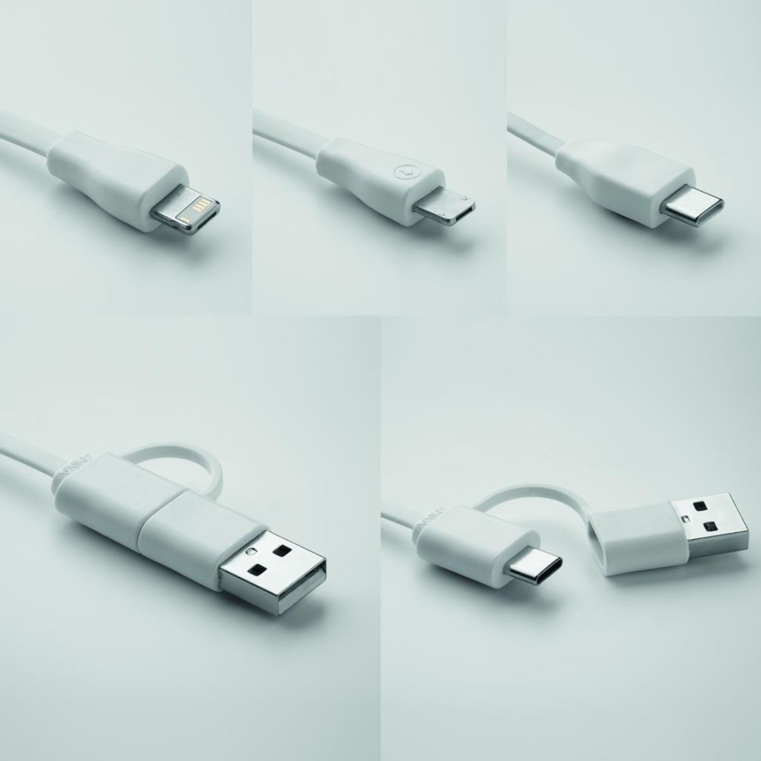 Llavero de bambú y funcionalidad de soporte para teléfono con cable de carga. Entrada: 2 en 1 Tipo-C y Tipo-A. Salida: Tipo-C y micro-B (2 en 1 pin).