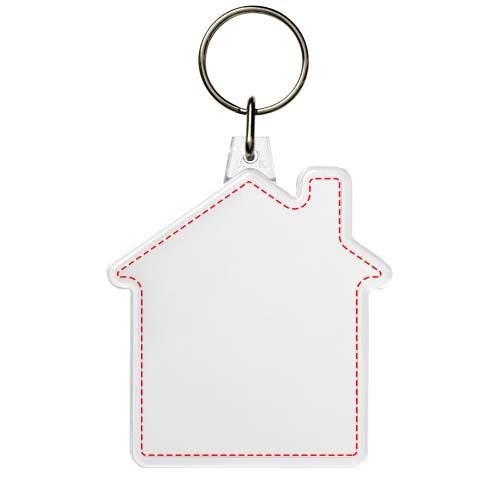 Llavero transparente con forma de casa con anilla abierta de metal. La anilla de metal es de perfil plano, ideal para envíos por correo postal. Dimensiones del encarte impreso: 5,9 x 5,6 cm.