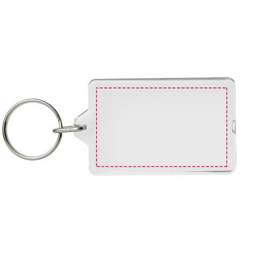 Llavero rectangular transparente G1 con anilla abierta de metal. Este llavero puede abrirse de nuevo con una moneda. La anilla de metal es de perfil plano, ideal para envíos por correo postal....