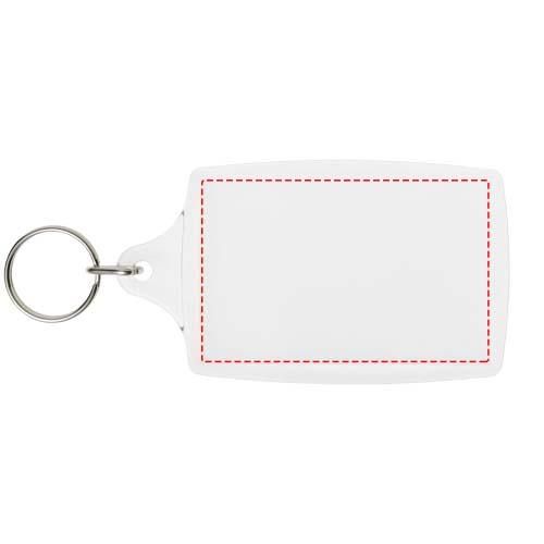Llavero transparente L4 con anilla abierta de metal. La anilla de metal es de perfil plano, ideal para envíos por correo postal. Dimensiones del encarte impreso: 7 x 4,5 cm.