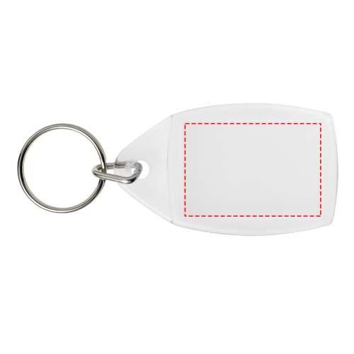Llavero transparente P5 con anilla abierta de metal. Dimensiones del encarte impreso: 3,5 x 2,4 cm.