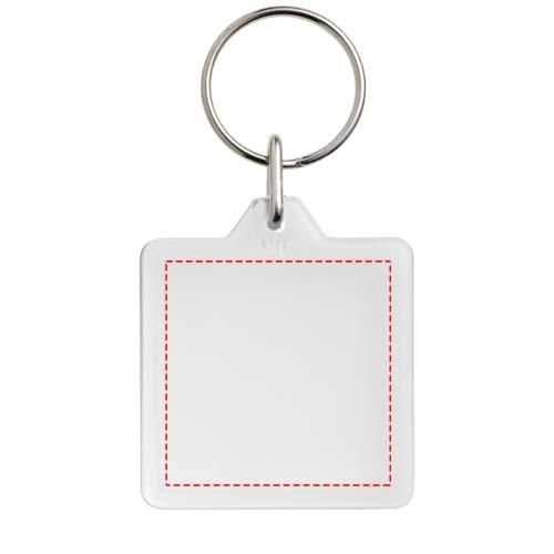 Llavero cuadrado transparente U1 con anilla abierta de metal. La anilla de metal es de perfil plano, ideal para envíos por correo postal. Dimensiones del encarte impreso: 3,2 x 3,2 cm.