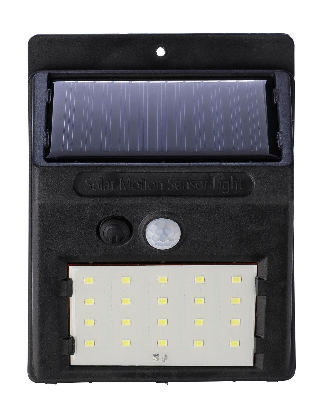 Lámpara solar de polipropileno con 20 LED COB. Cuenta con sensor nocturno (CDS) y sensor de movimiento (PIR). Incluye batería de 800 mAh, cable de carga, clasificación IP44 y funciones de luz constante o intermitente. Presentada en una caja de cartón marrón.
