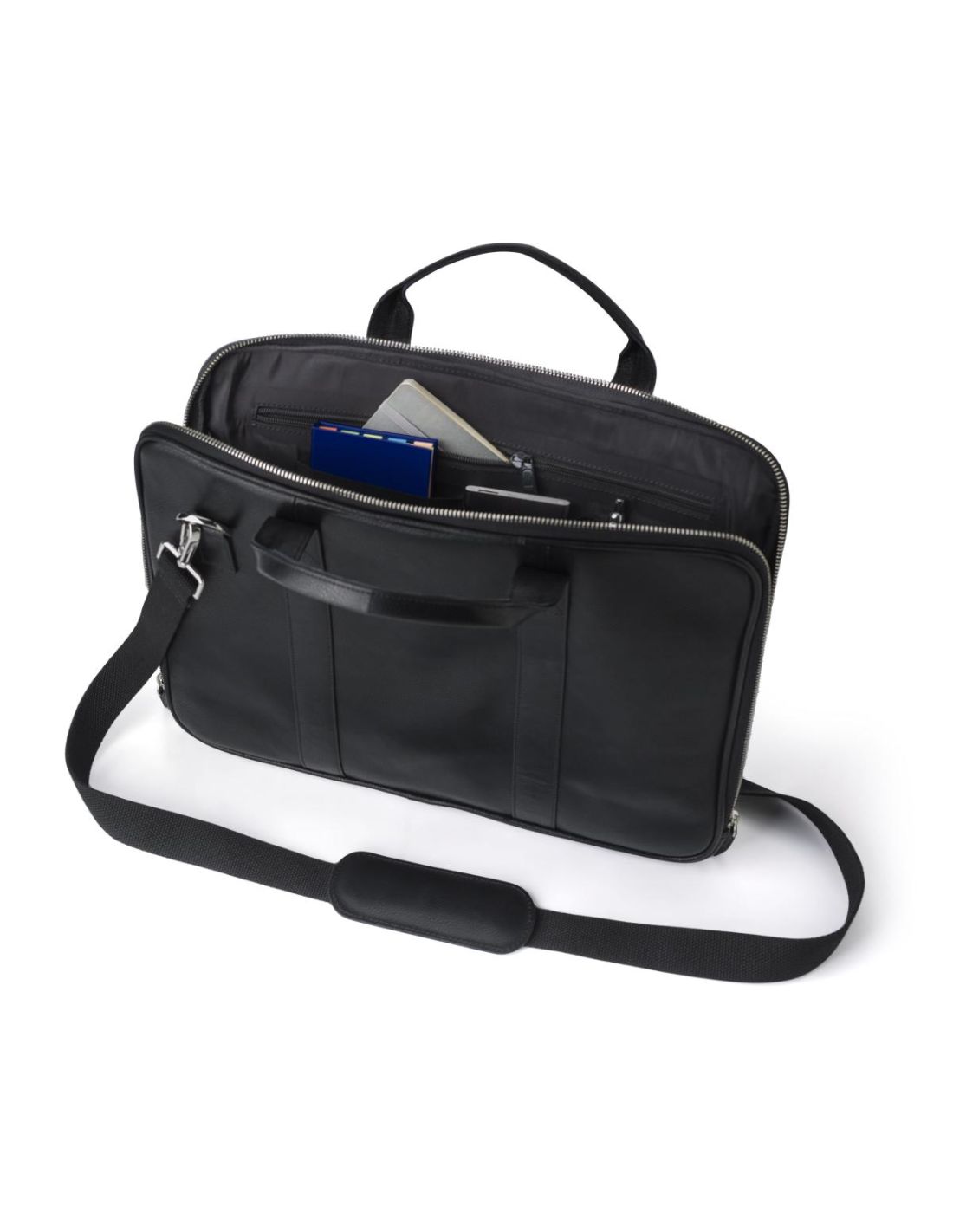 Maletín de piel de vaca, para portátil (15 '') con cremallera. Múltiples compartimentos interiores: 4 bolsillos, un compartimento con cremallera y un compartimento para el portátil con velcro. Dos asas cortas de cuero y una bandolera ajustable de nailon.