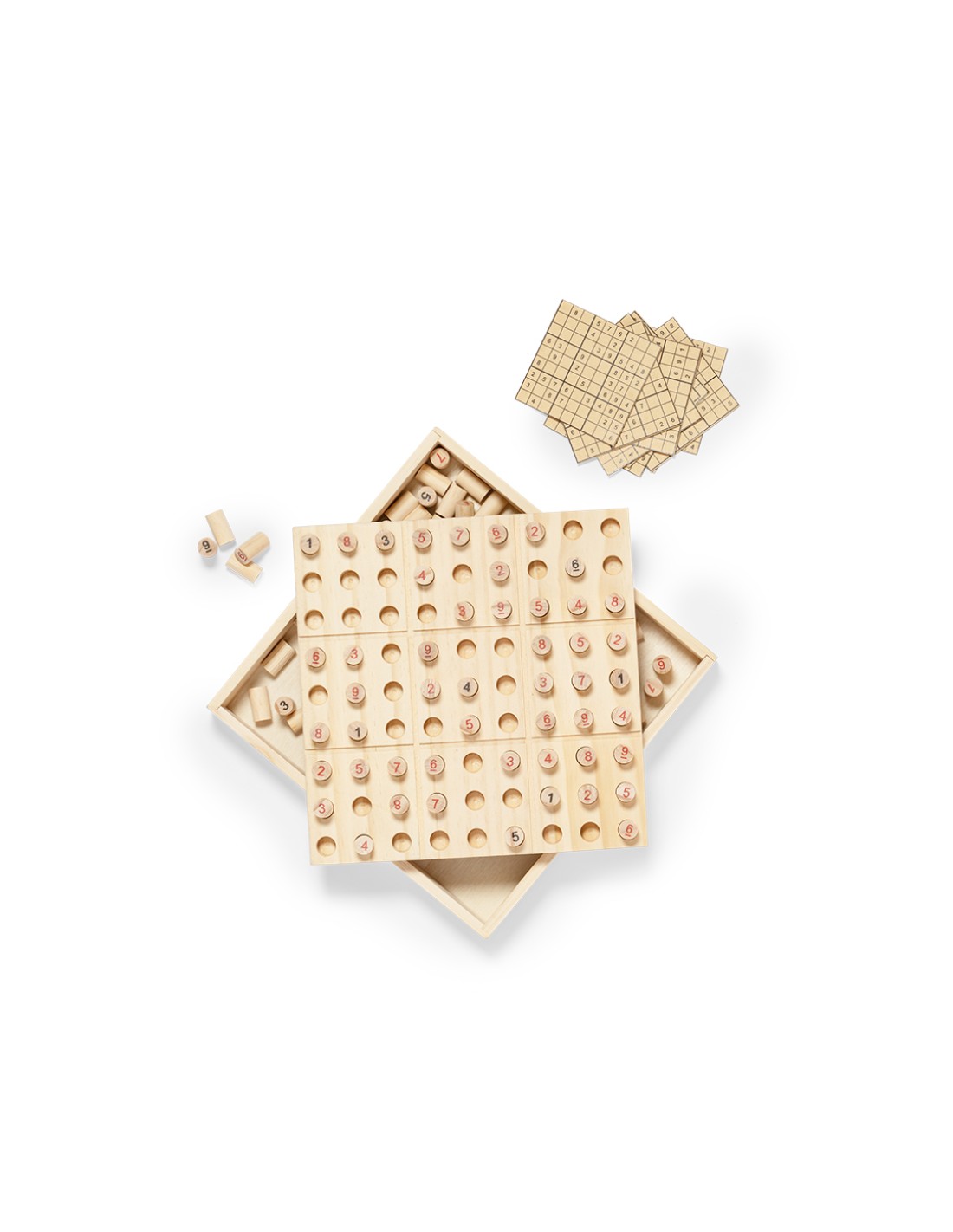 Juego de habilidad sudoku fabricado en resistente madera. Incluye 81 fichas de madera numeradas y 10 cartas. Con reglas del juego en español e inglés. Presentado en estuche de madera con tapa-tablero.