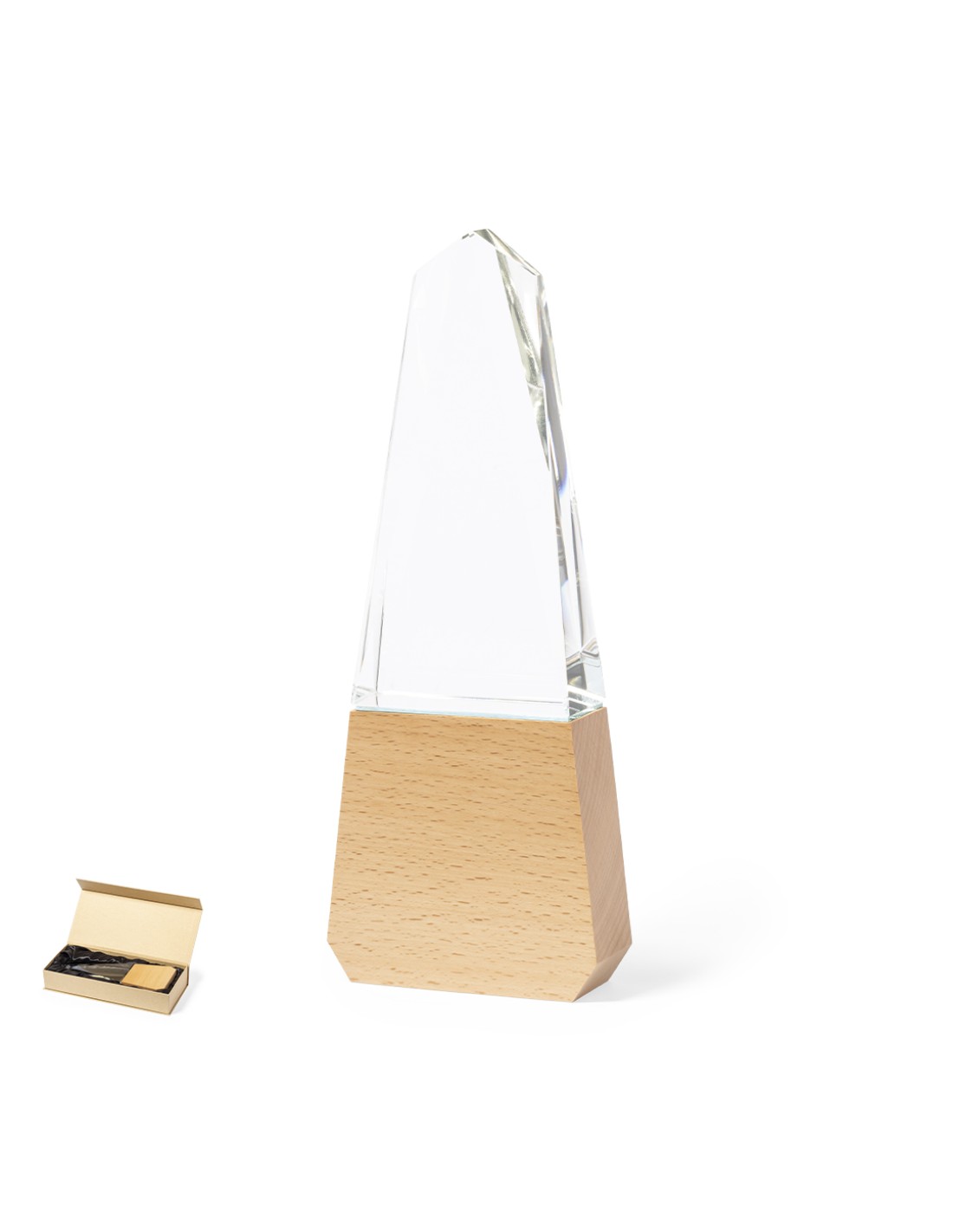 Placa conmemorativa fabricada en cristal grueso y resistente, con base en madera natural. Presentada en estuche de protección kraft, con cierre...