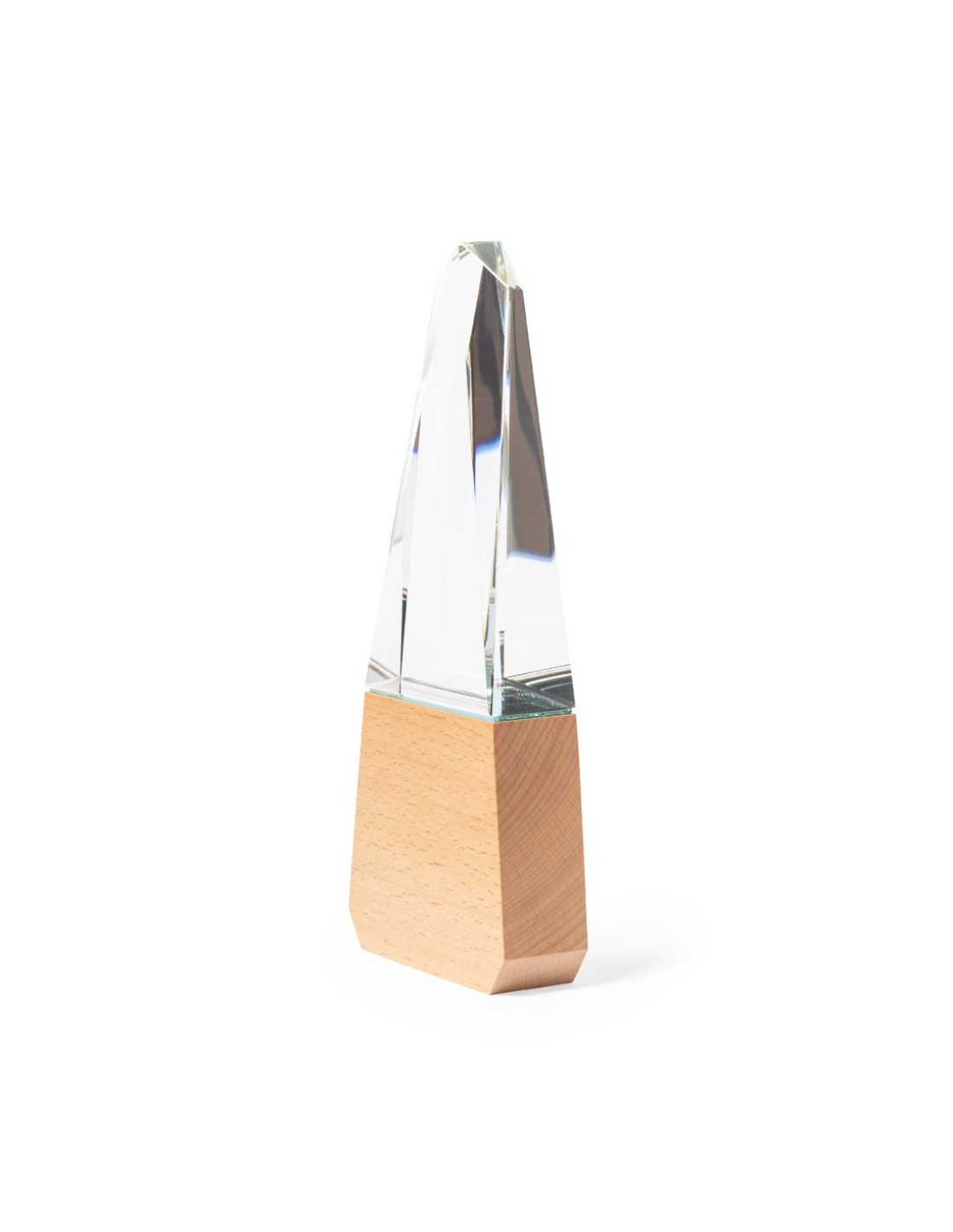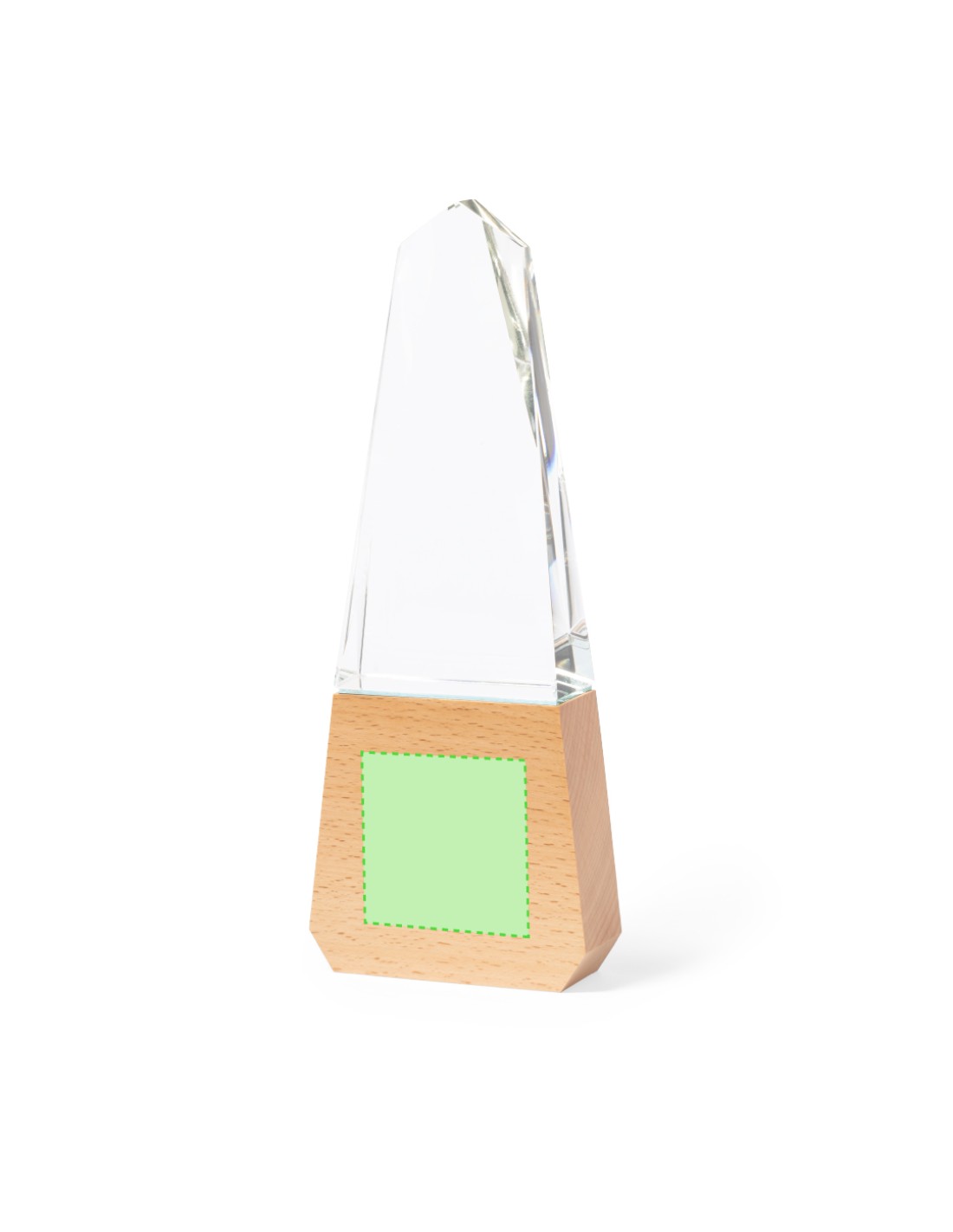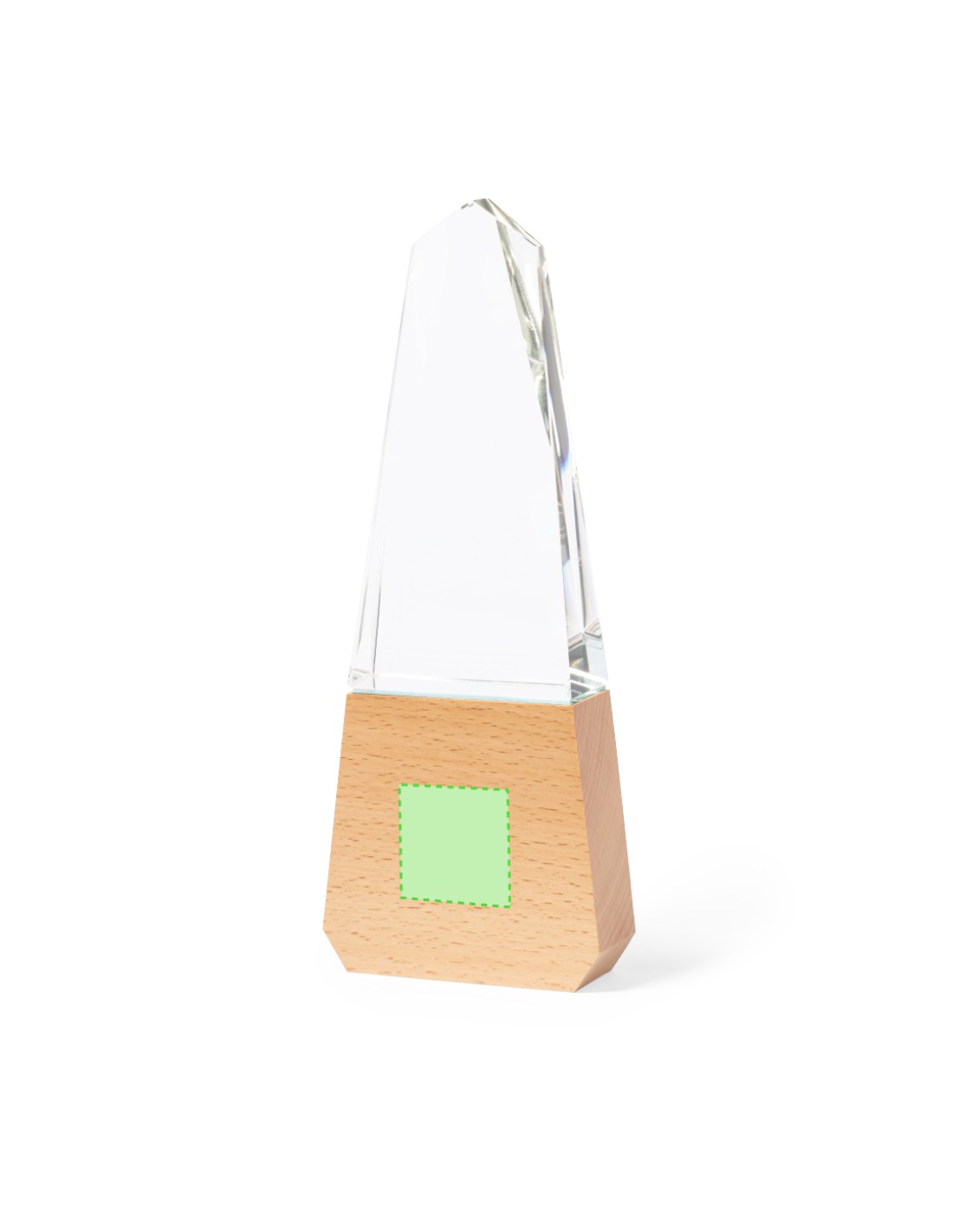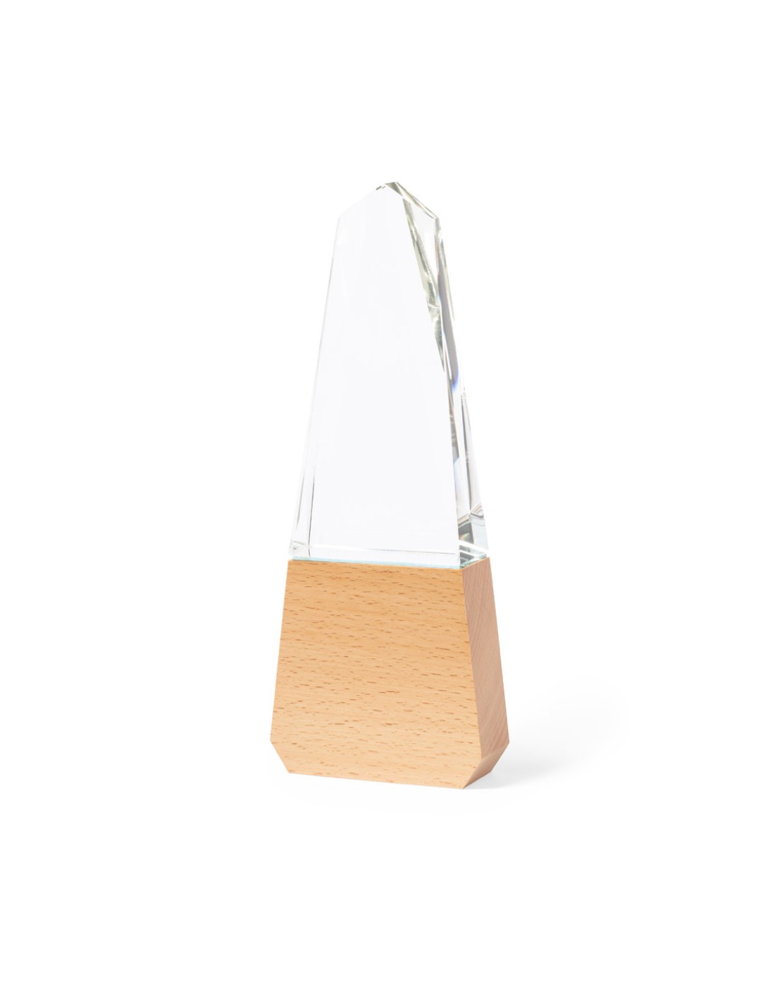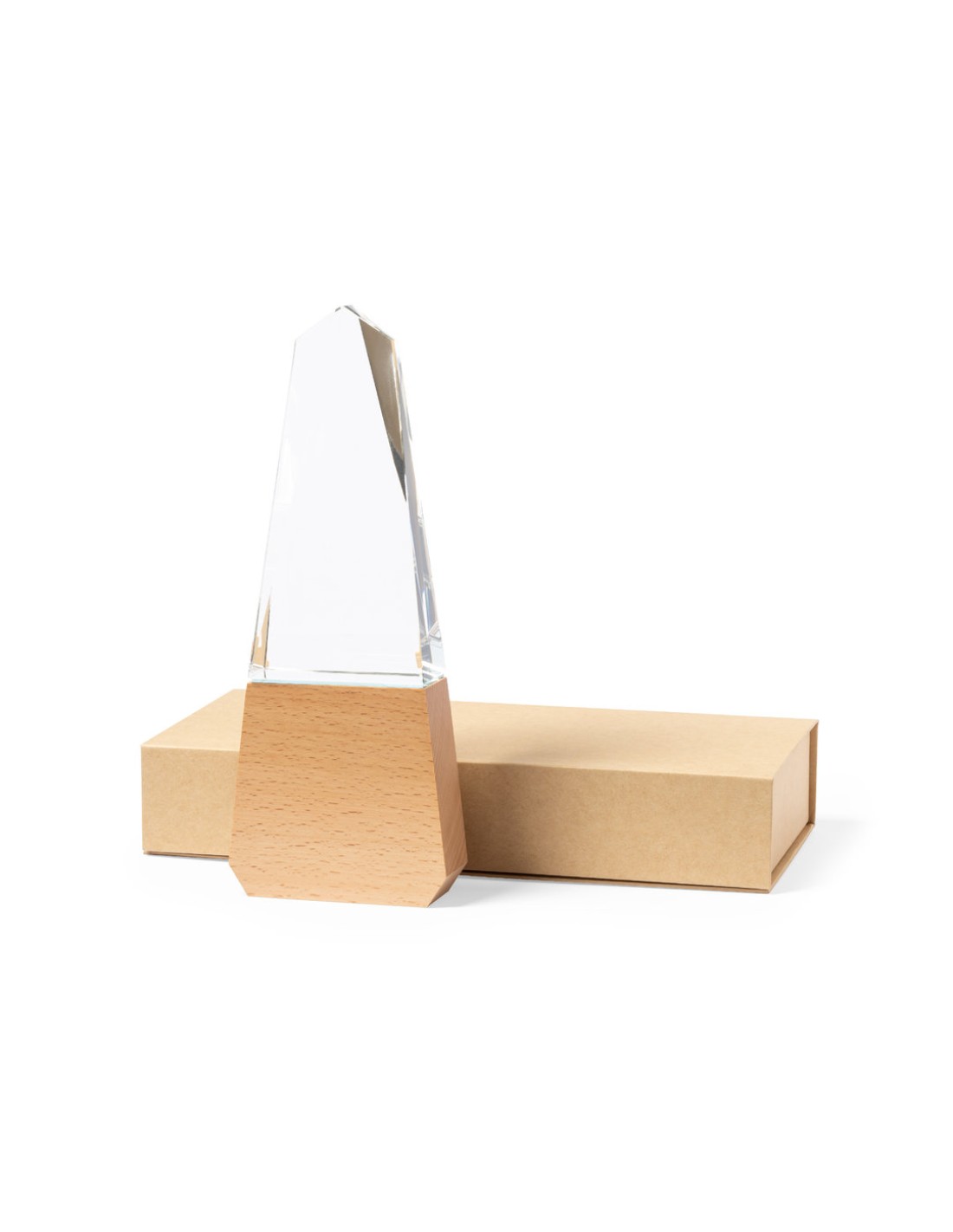 Placa conmemorativa fabricada en cristal grueso y resistente, con base en madera natural. Presentada en estuche de protección kraft, con cierre magnético y espuma interior.