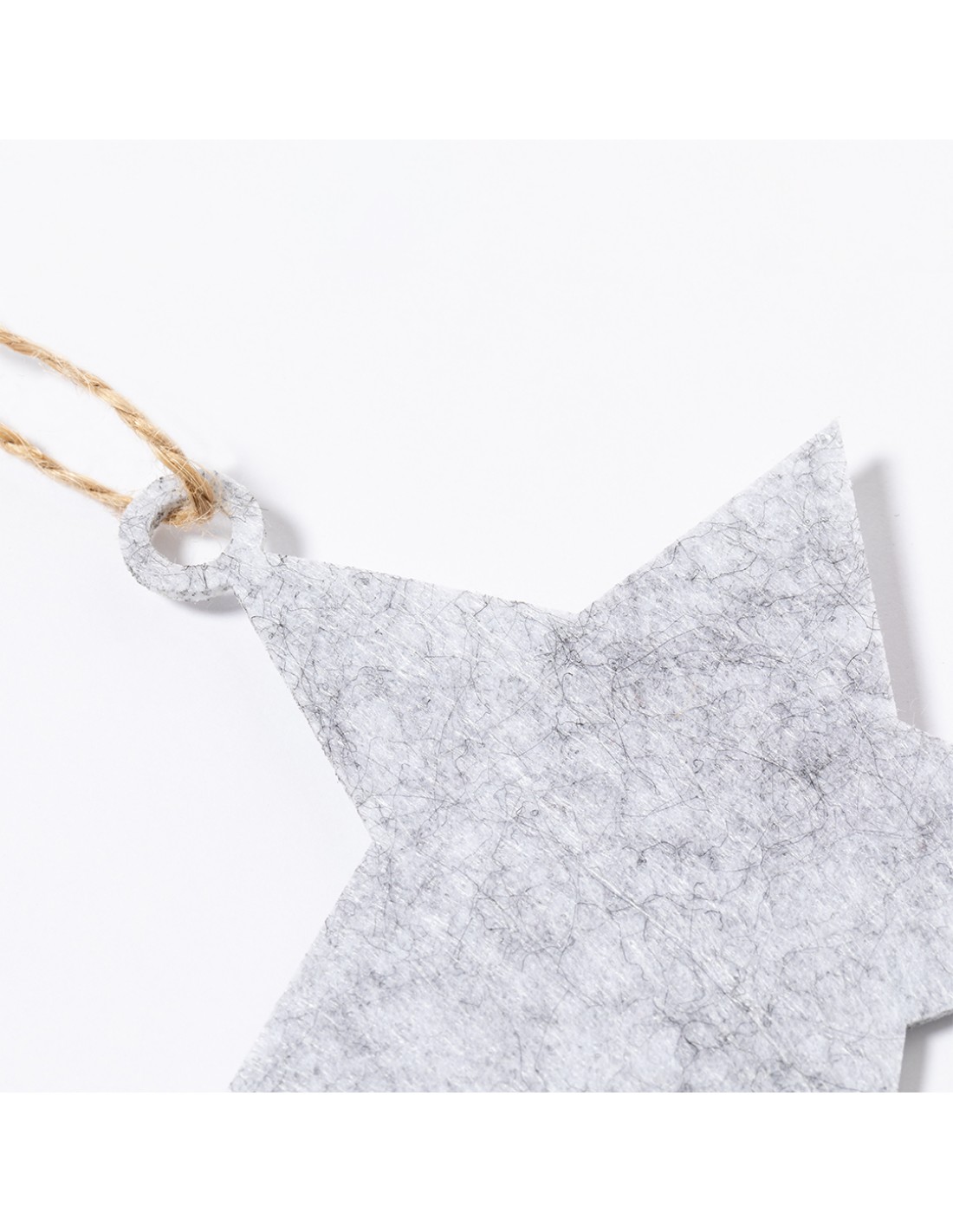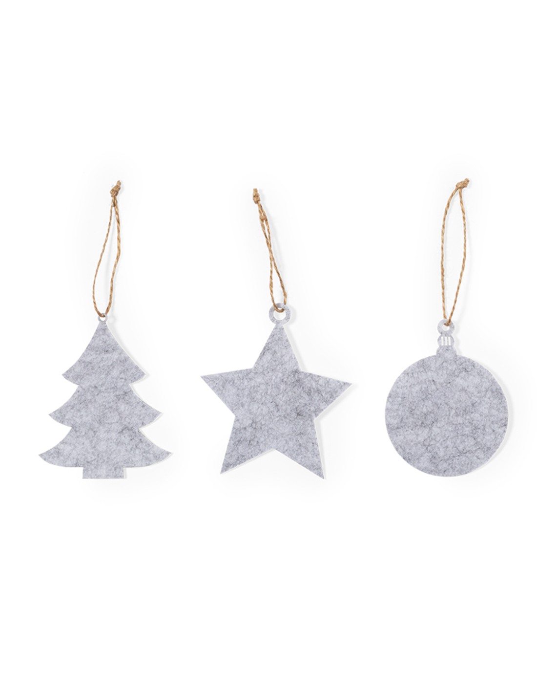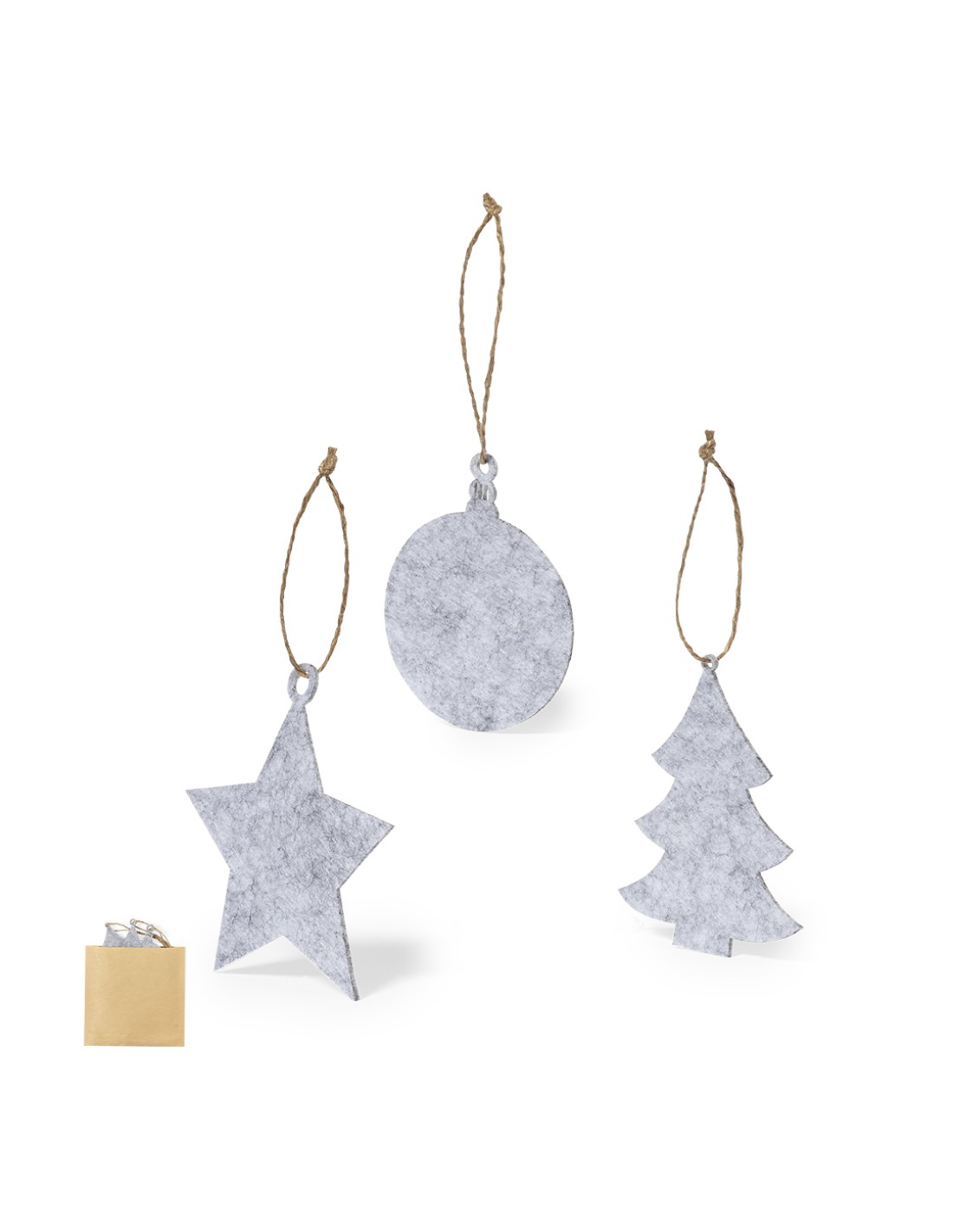 Set de adornos navideños de 3 piezas fabricadas en suave fieltro. Incluye en 3 diseños: Árbol de Navidad, Estrella y Bola Navideña. Todas las piezas incluyen colgador. Presentado en bolsa de papel reciclado.