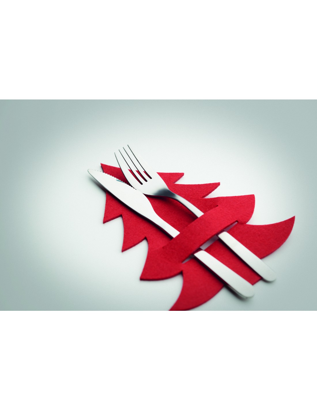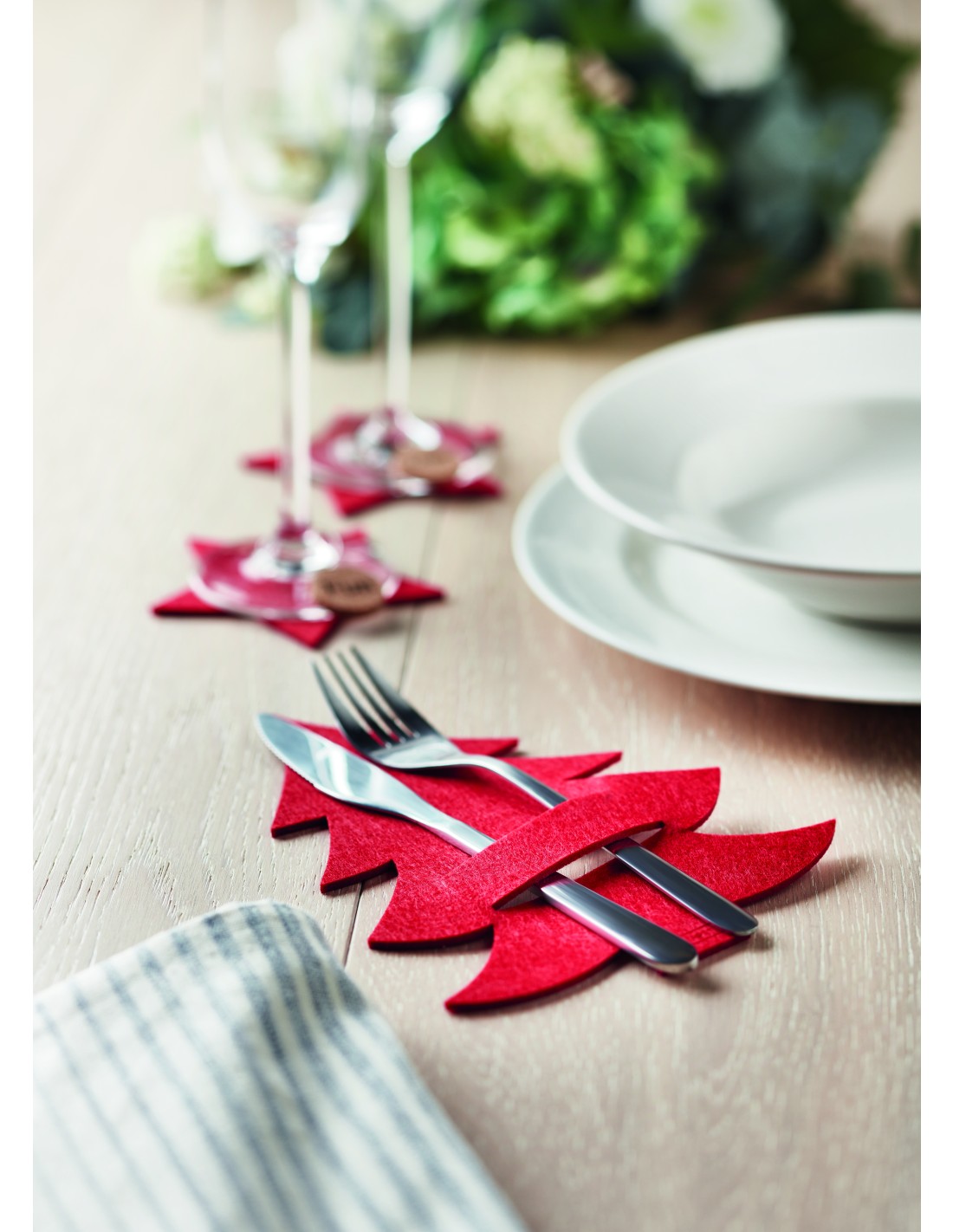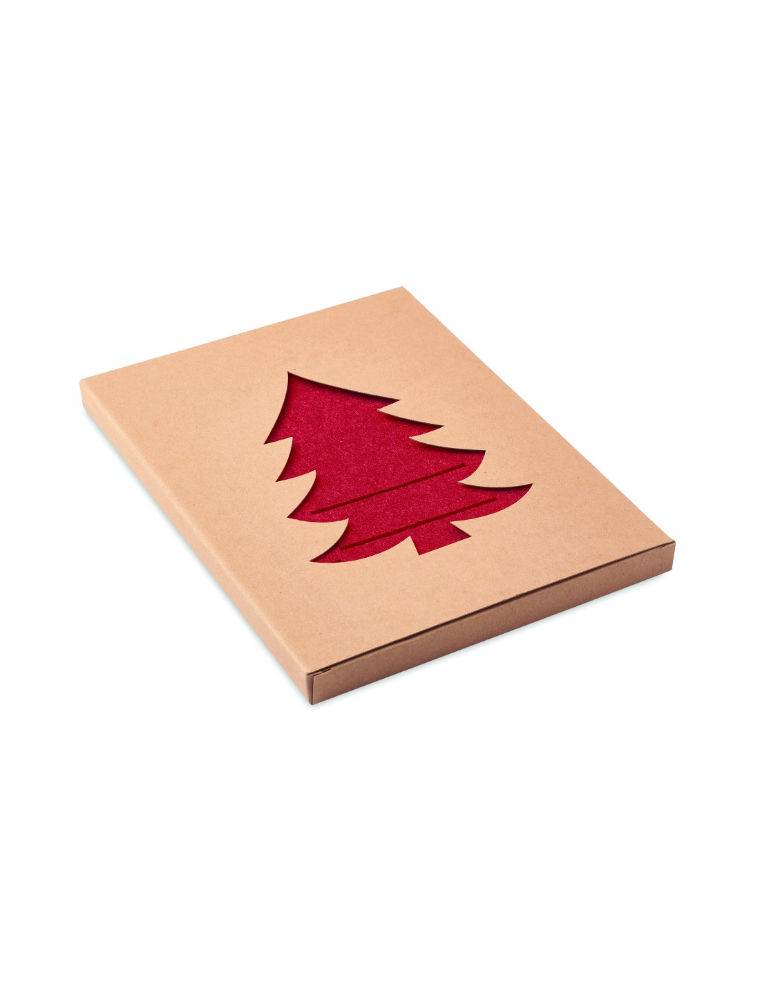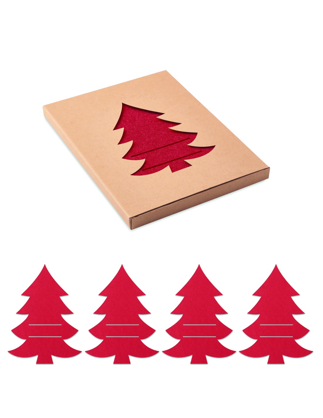 Juego de 4 porta cubiertos de fieltro RPET en forma de árbol de Navidad presentados en caja kraft.
