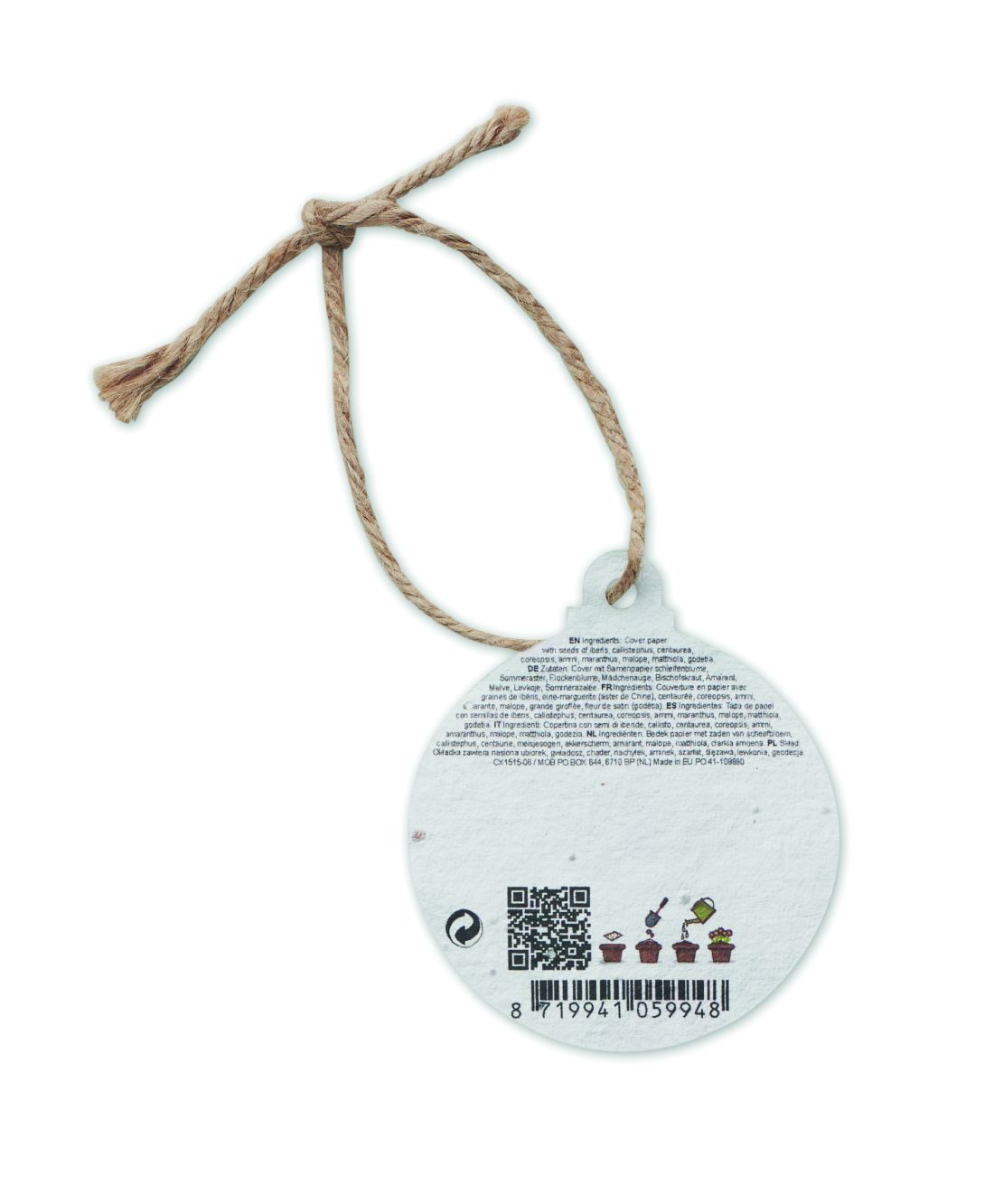 Adorno navideño hecho de papel de semillas en forma redonda de flores silvestres y cuerda de yute. Después de usarlo, planta el adorno y observa cómo crecen en tu jardín. Fabricado en la UE. Decora tu árbol de Navidad o tu casa con este adorno de papel. Después de las fiestas, puedes utilizar este adorno para cultivar una mezcla de flores silvestres en tu jardín. ¡Un artículo realmente sostenible y reutilizado!