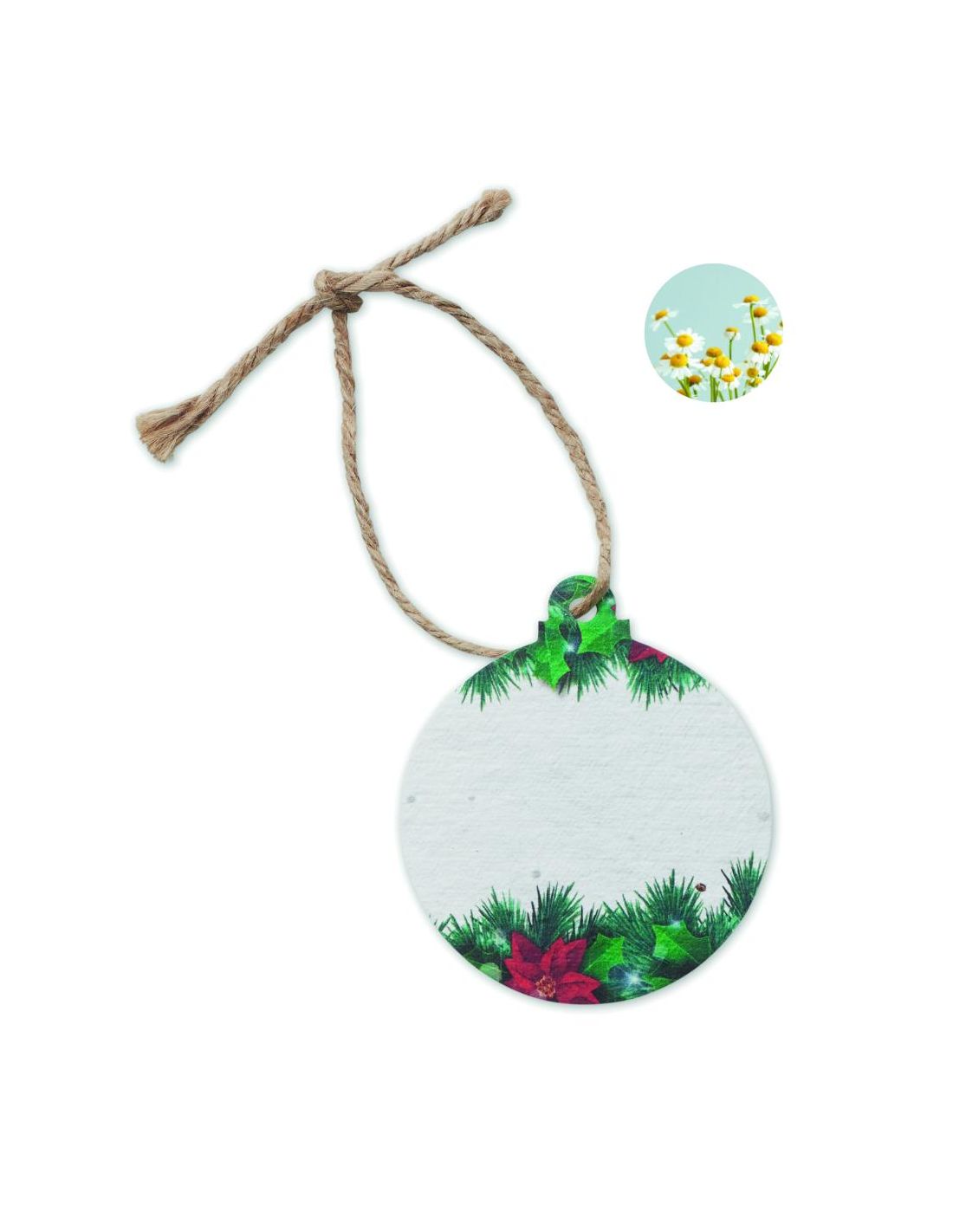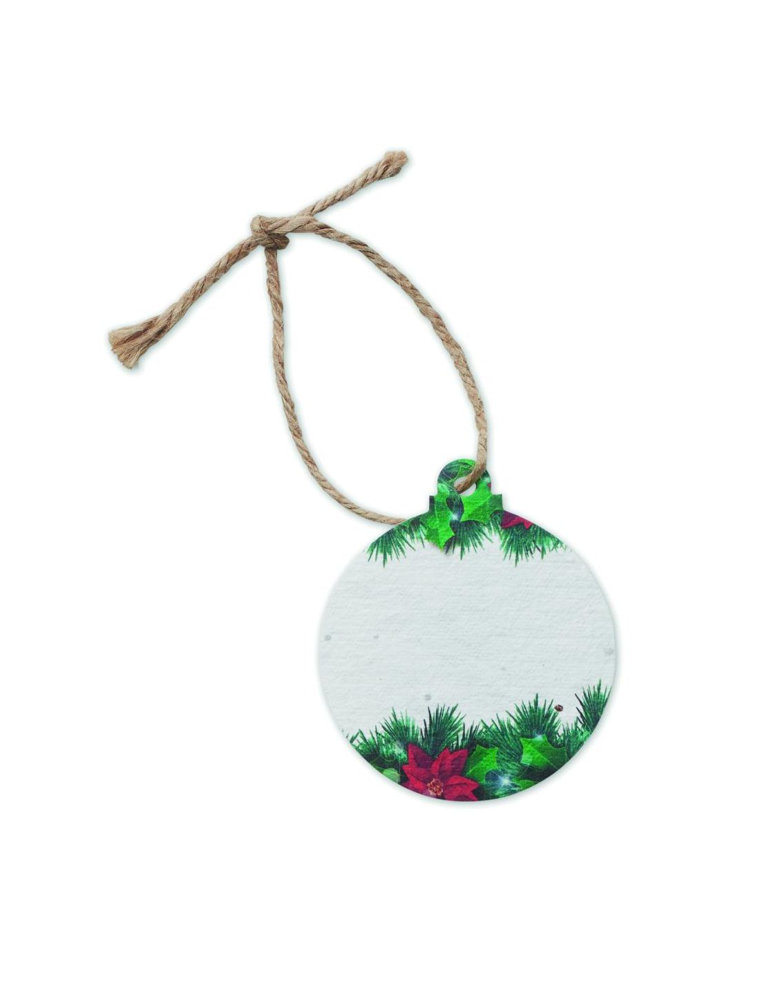 Adorno navideño hecho de papel de semillas en forma redonda de flores silvestres y cuerda de yute. Después de usarlo, planta el adorno y observa có…
