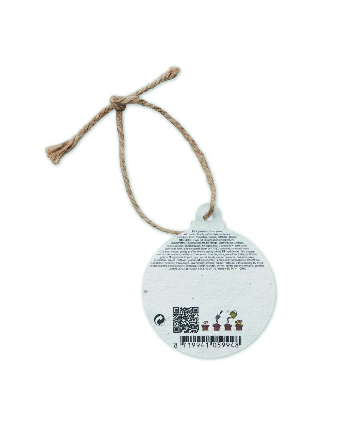 Adorno navideño hecho de papel de semillas en forma redonda de flores silvestres y cuerda de yute. Después de usarlo, planta el adorno y observa cómo crecen en tu jardín. Fabricado en la UE. Decora tu árbol de Navidad o tu casa con este adorno de papel. Después de las fiestas, puedes utilizar este adorno para cultivar una mezcla de flores silvestres en tu jardín. ¡Un artículo realmente sostenible y reutilizado!