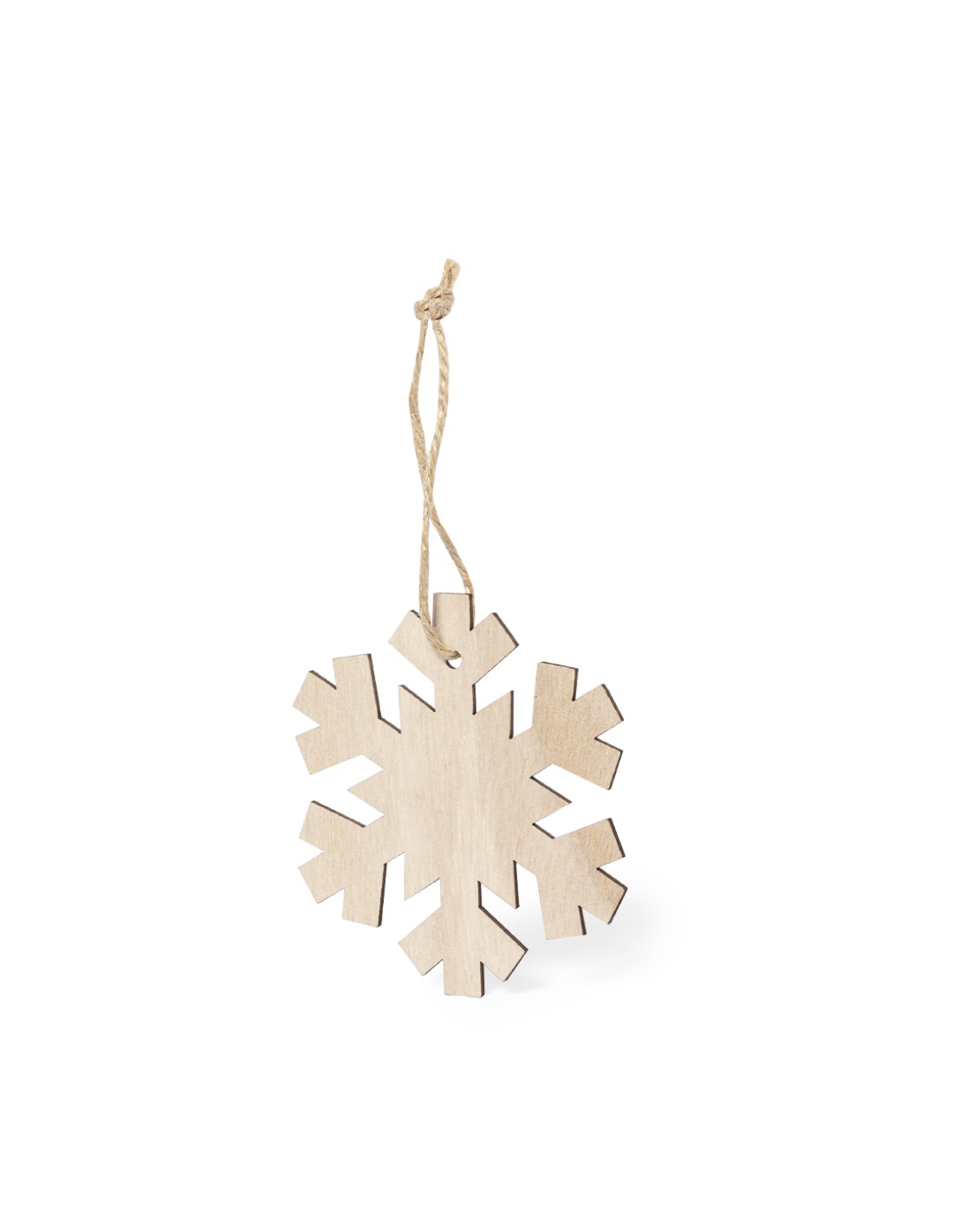 Elegante y moderno adorno navideño en suave madera natural. Incluye accesorio para colgar en yute natural y está disponible en cuatro diseños: Copo...