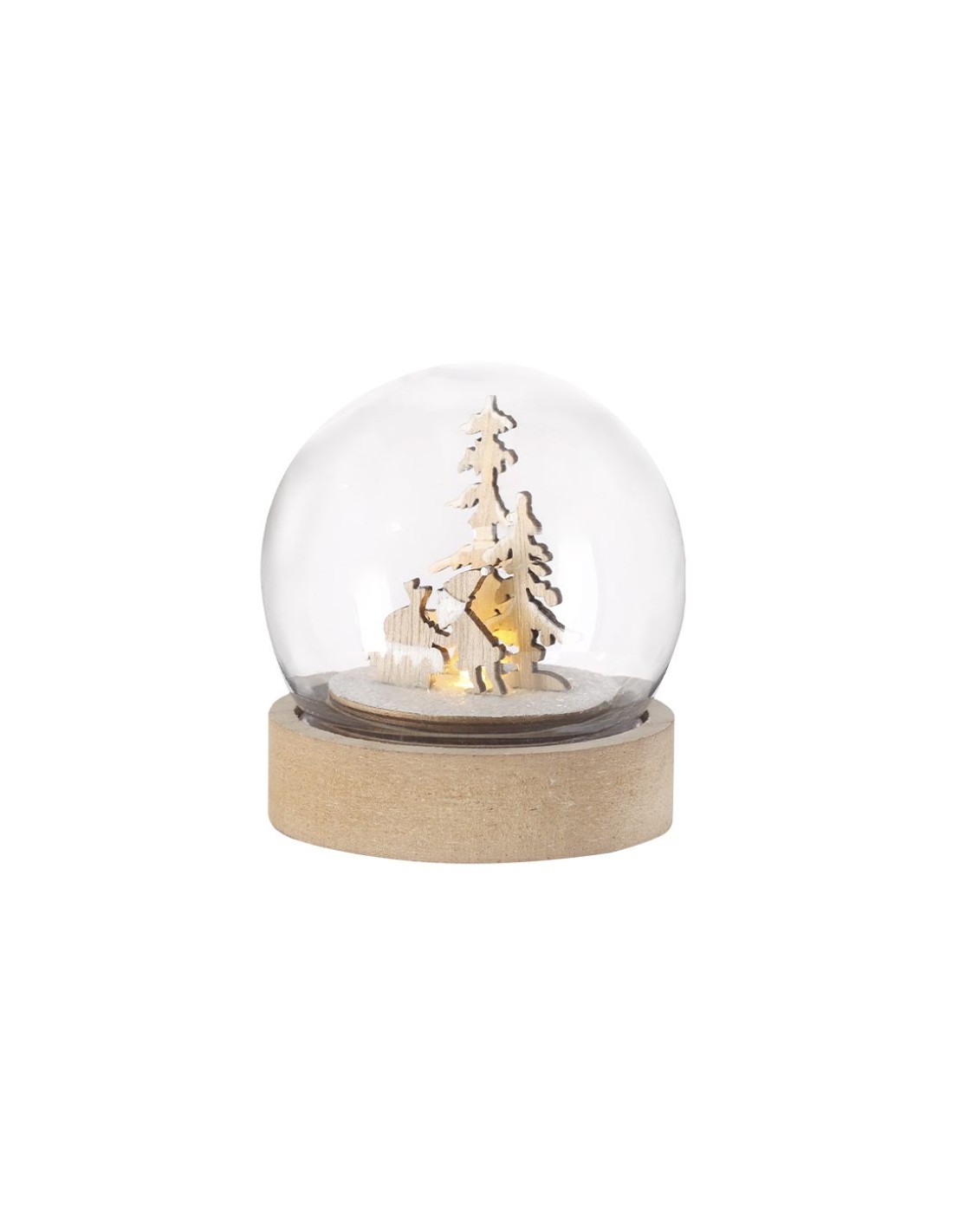Bola iluminada con original diseño navideño. Elaborada en resistente material acrílico, con base de madera lisa para impresión. Dispone de iluminación interior con 1 LED en tono blanco. Alimentación por 3 pilas de botón, incluidas, con botón ON/OFF en la base. Elaborado con elementos vegetales para así fomentar la utilización de materias primas naturales y reducir las emisiones contaminantes.