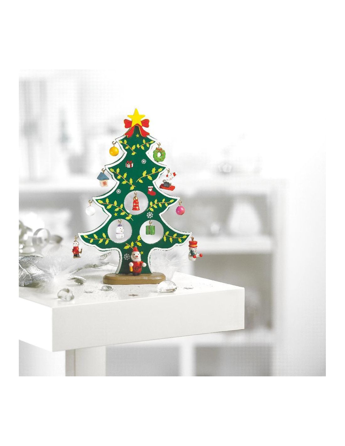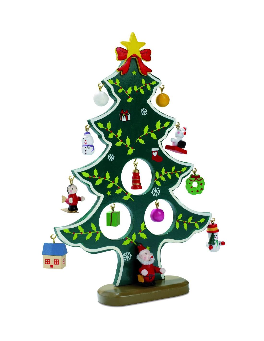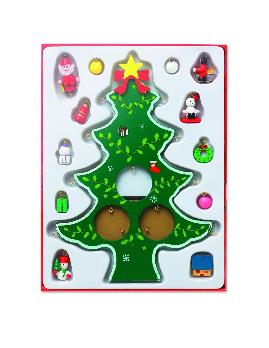 Árbol de navidad de madera con 12 adornos para colgar. Presentado en una caja individual con tapa transparente.