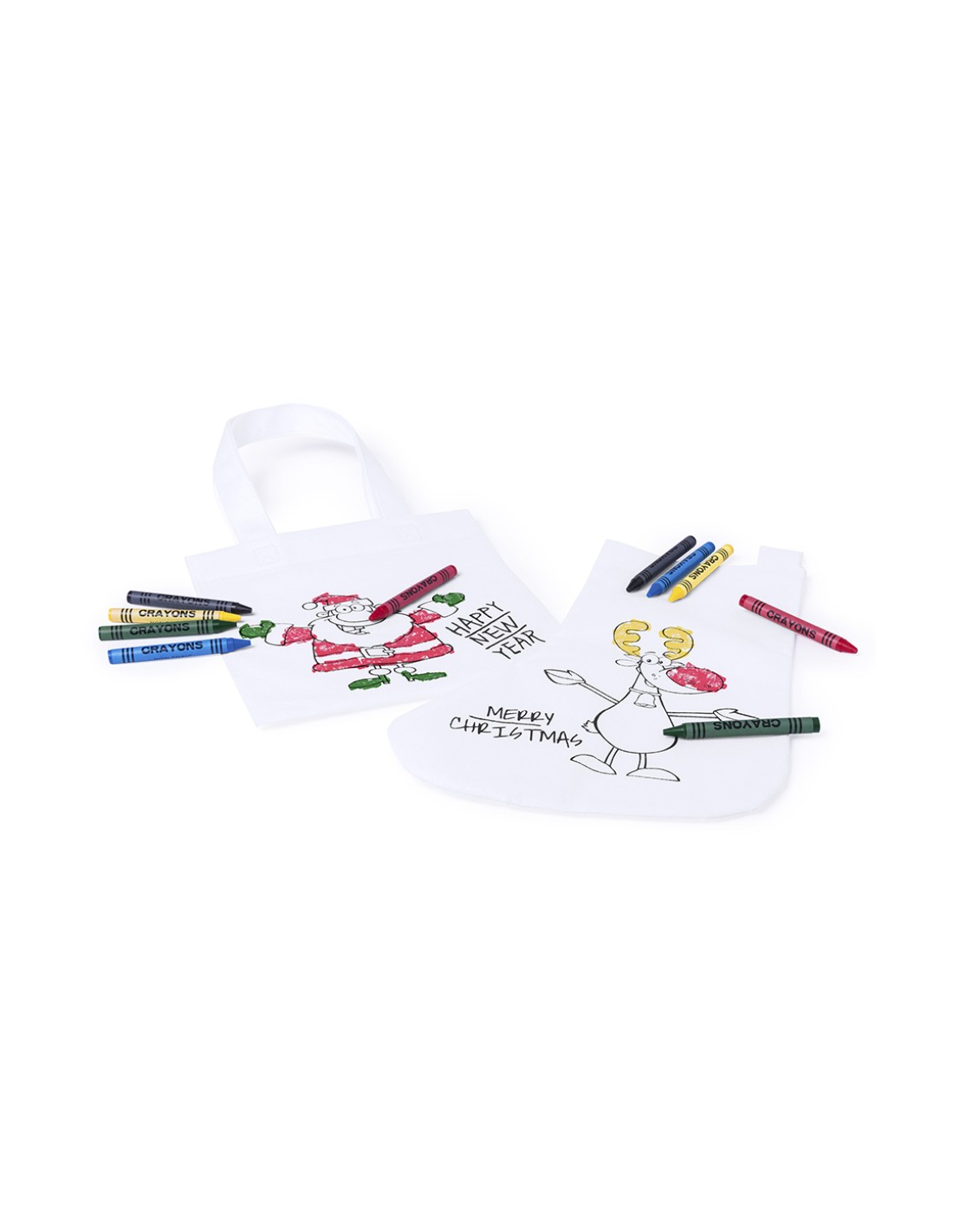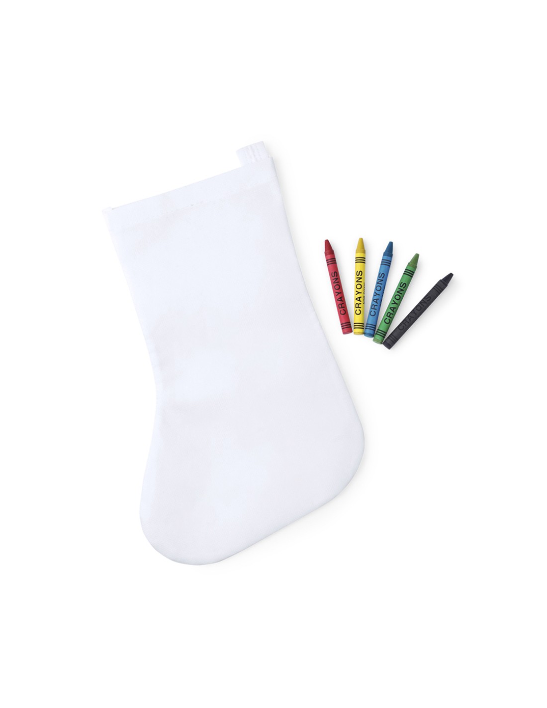 Calcetín de non-woven en color blanco especialmente diseñado para colorear con ceras. Incluye 5 ceras de cuerpo cilíndrico en variados colores. Con cinta para colgar y de acabado termosellado.