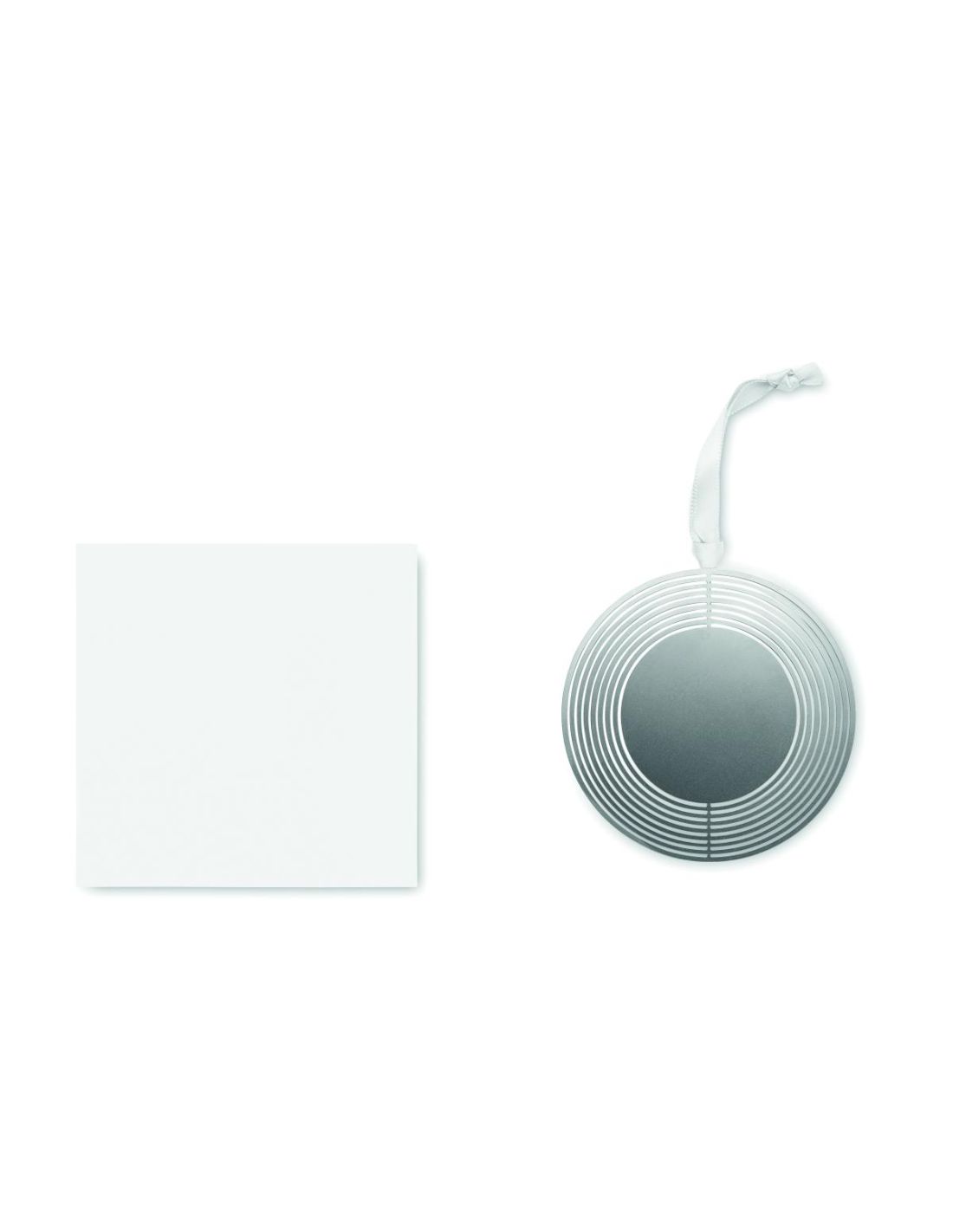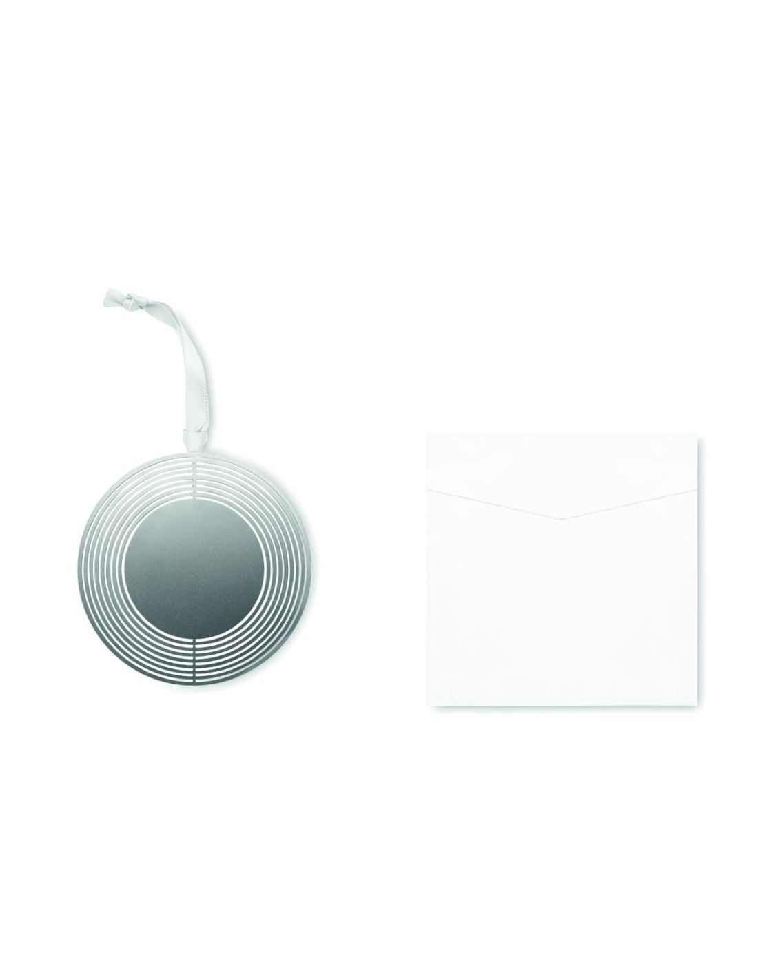 Colgante en acero inoxidable de forma redondo. Presentado en un sobre. Fácil de doblar en un bonito cuadrado.