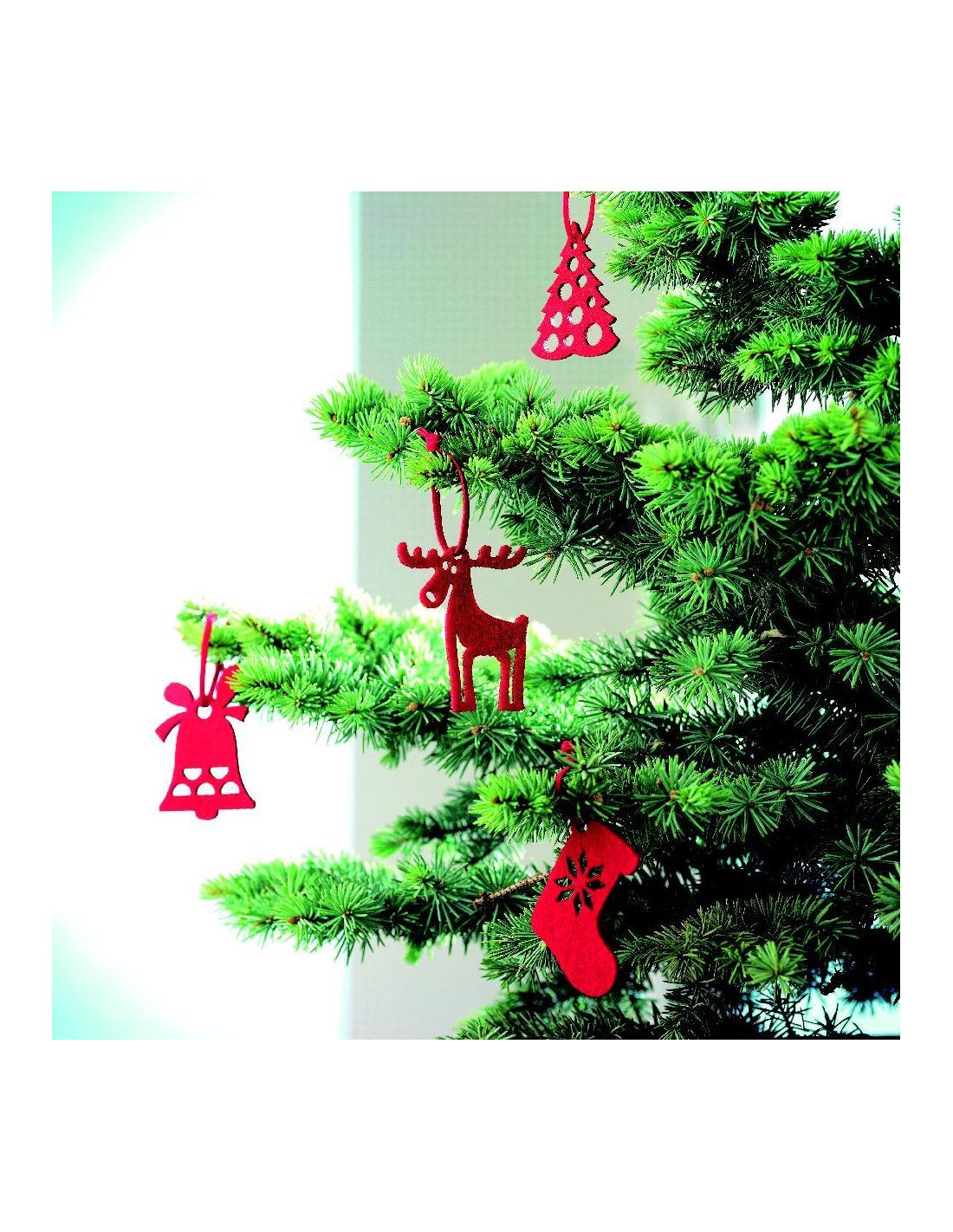 Juego de 6 adornos en fieltro para colgar en el árbol de navidad: árbol, copo de nieve, campana, calcetín, reno y flor de navidad.