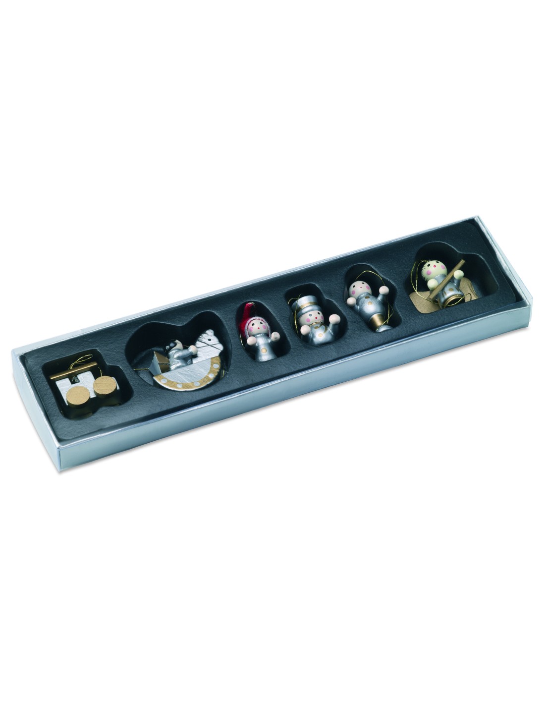 Juego de 6 adornos de madera para el árbol de navidad, presentado en caja de cartón con tapa transparente.