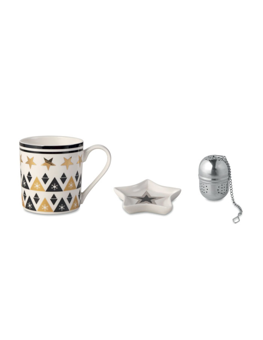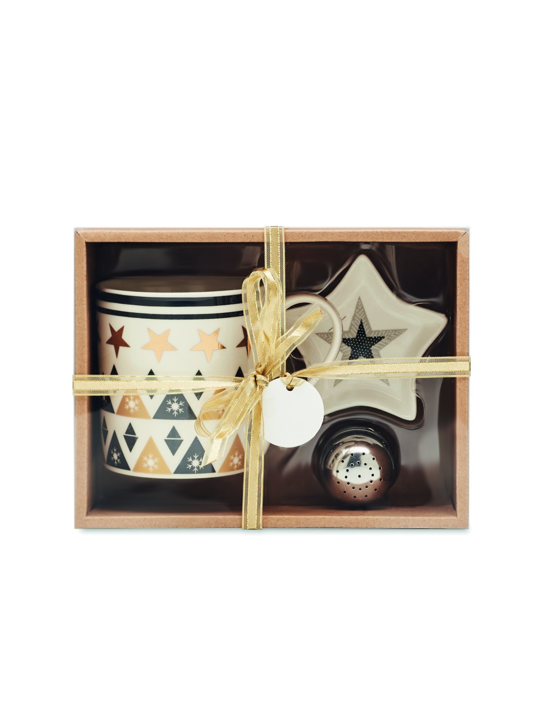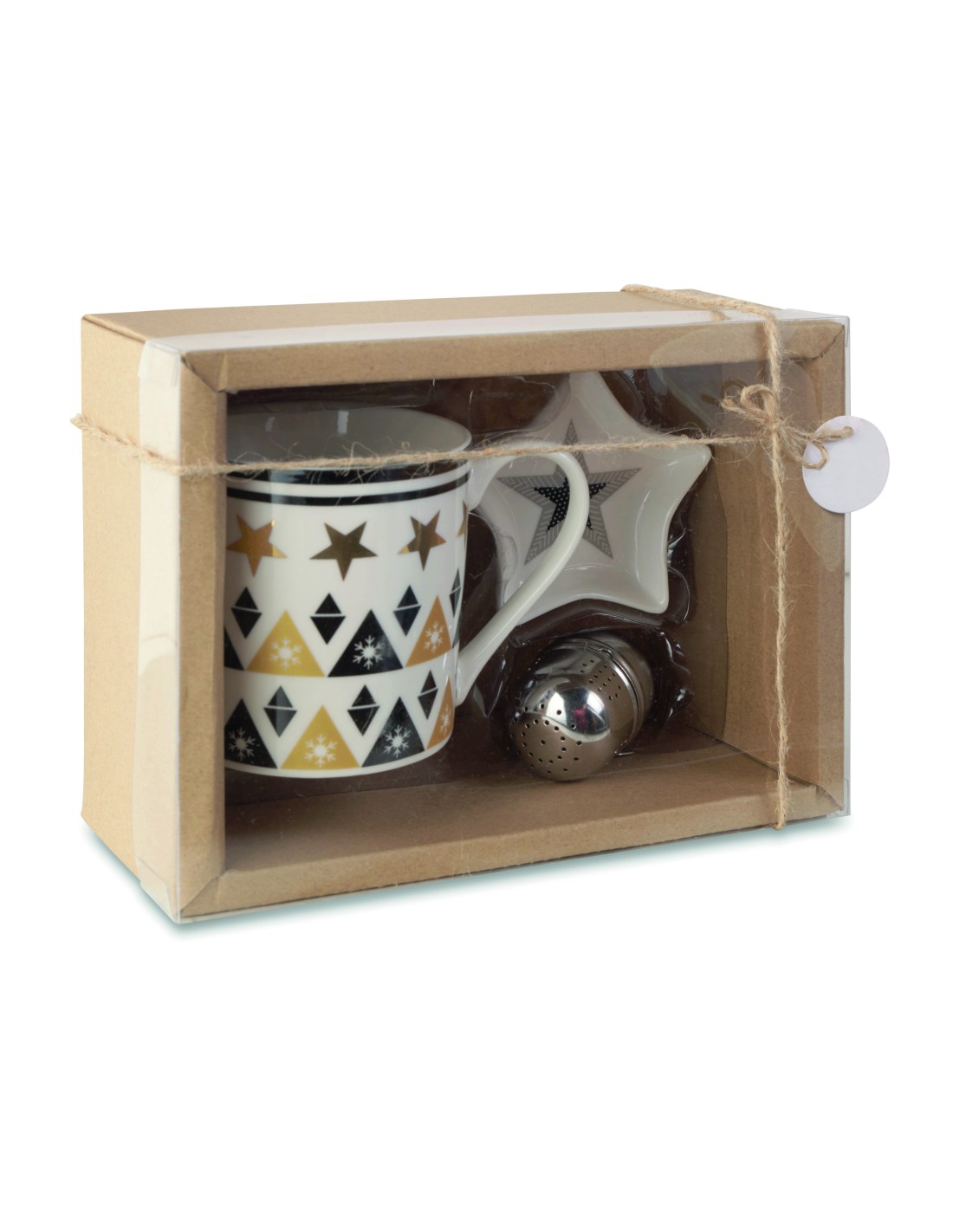 Set de taza cerámica, filtro para te y plato. Presentado en caja de cartón, con funda de PVC, cordón y etiqueta.