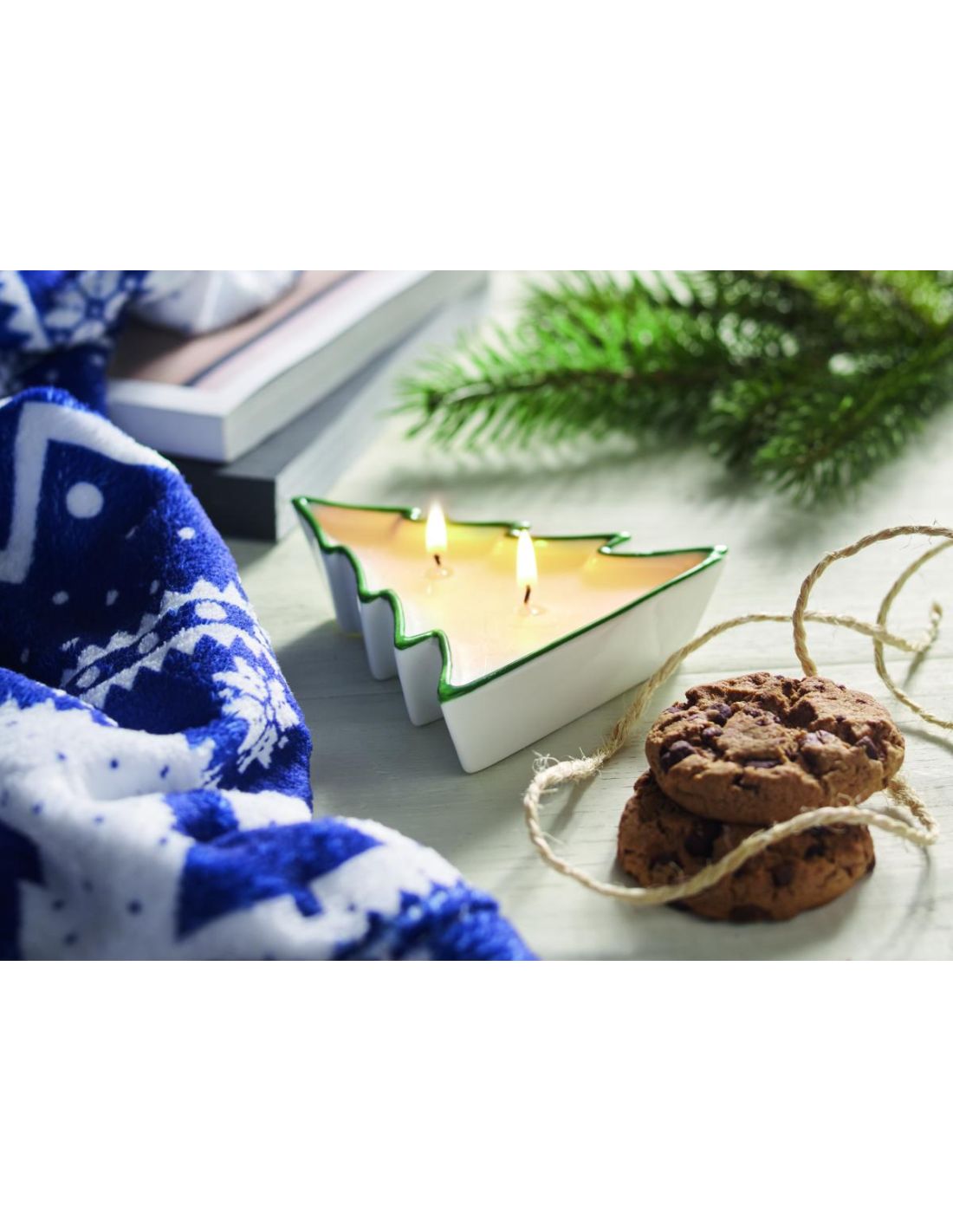 Vela de cera vegetal en un soporte de porcelana en forma de árbol de Navidad con 2 mechas. 60 gr. Tiempo de combustión: 4 horas.