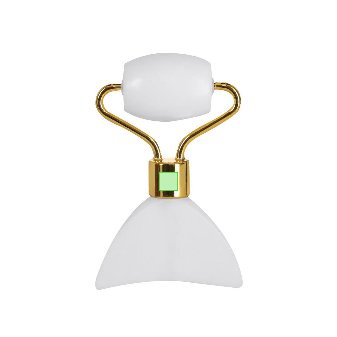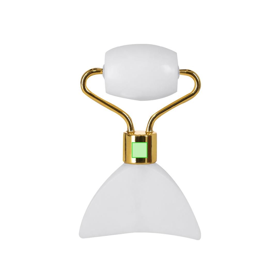 Rodillo facial de alta calidad fabricado en piedra jade blanco. Agradable masajeador de mano para el rostro, con cilindro facial fabricados en suave piedra pulida y espátula.