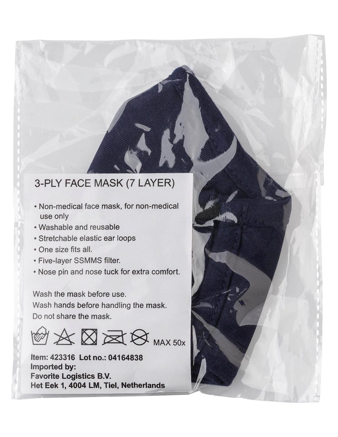 Mascarilla reutilizable de algodón. Polibag individual, cajas de 50 uds. Correas elásticas y ajuste nasal. 7 capas (5 capas interiores de filtro Melt Blown SSMMS) y filtración bacteriana del 95%. Lavable a mano (aprox. 25 lavados). No esterilizada.