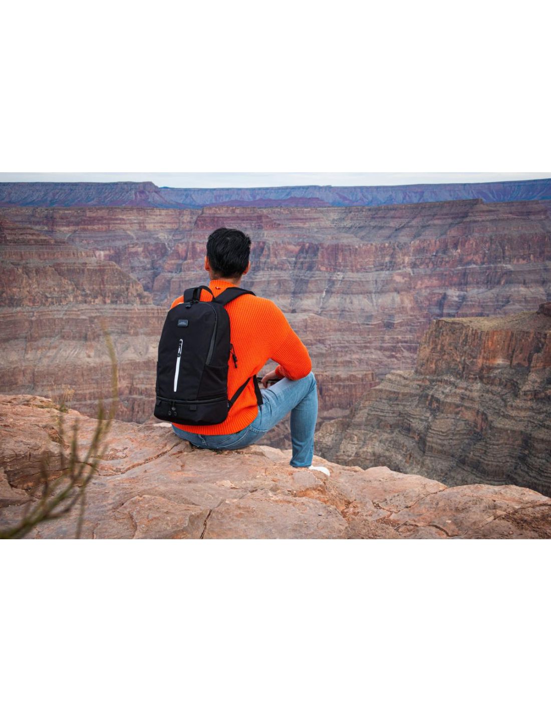 La mochila Nomad está hecha con botellas de PET recicladas y diseñada para aventuras urbanas, caminatas y viajes. Cuenta con una abertura levadiza para acceder fácilmente al compartimento principal y un bolsillo isotérmico para mantener la comida o bebida fresca o caliente. Con múltiples bolsillos organizadores, la funda interna se adapta a un depósito de hidratación o a un portátil de 15,6''. Su espalda acolchada transpirable que absorbe los golpes garantiza la comodidad, mientras que los bolsillos laterales ajustables sostienen botellas de agua o paraguas. Repele el agua y las manchas con elementos reflectantes para la seguridad vial.