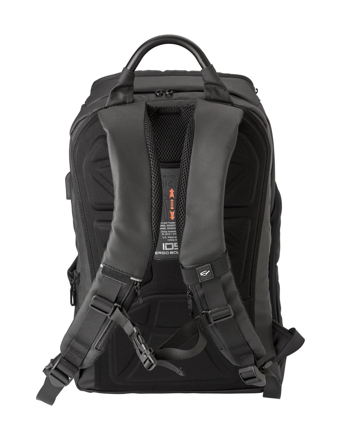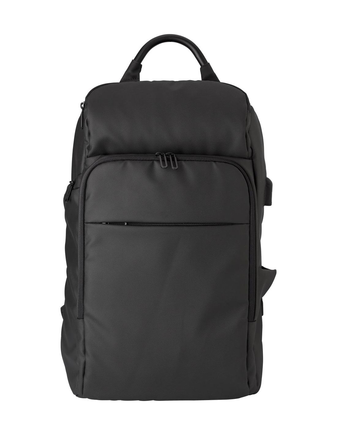 Mochila de PU (600 D) con bolsillos frontales y laterales (uno isotérmico). Gran compartimiento acolchado para un portátil de 15''. Espalda acolchada y tirantes ajustables acolchados. Pieza especial para repartir el peso. Puerto y cable USB.