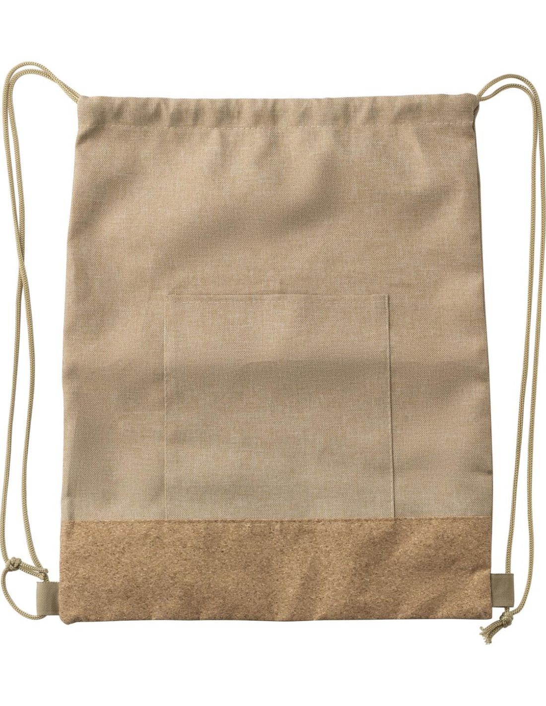 Mochila de cuerdas, de poliéster rPET (600D) y corcho. Con un pequeño bolsillo en la parte delantera y etiqueta rPET.
