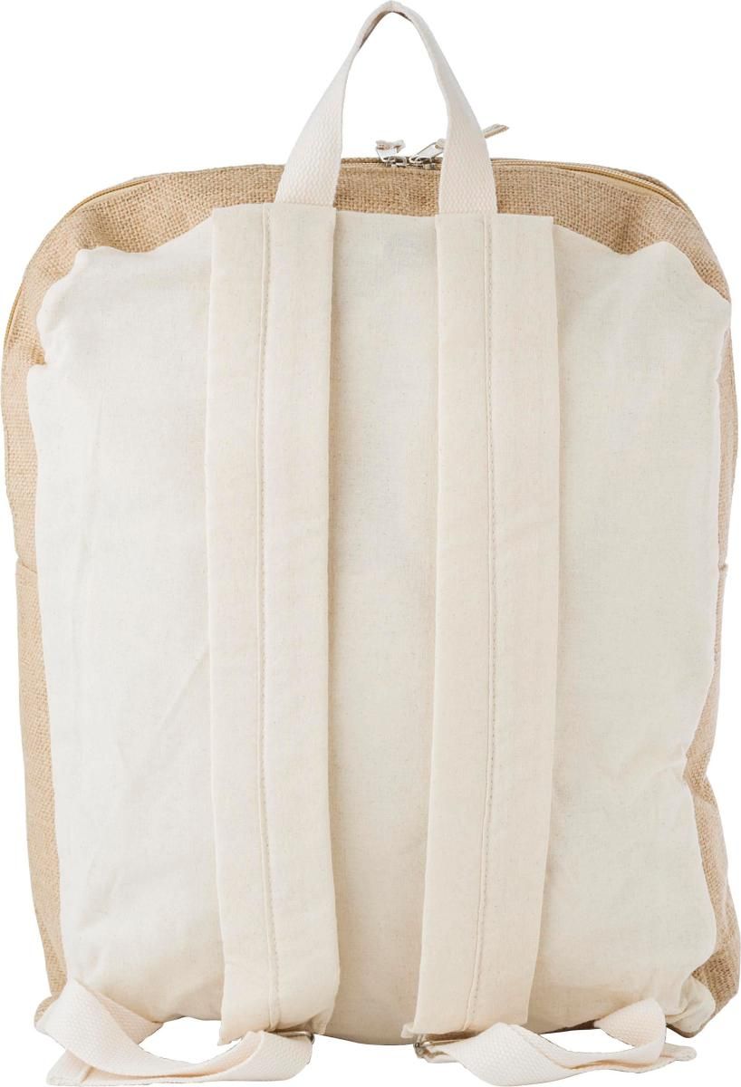 Mochila de yute con detalles de algodón. Tiene un compartimento principal con cremallera y bolsillo frontal de algodón, para imprimir. Tirantes ajustables.