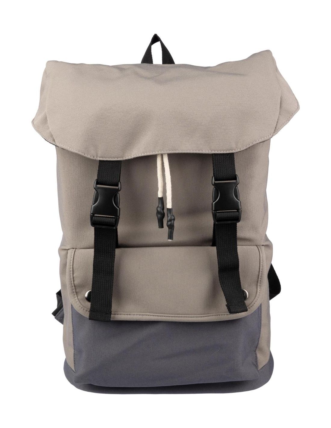 Mochila de lona de poliéster (600D) con forro de PU (210D) y espalda de espuma PE (8 mm). Gran compartimento con cordón con cierre de hebilla y bolsillo para el portátil (15’’). Bolsillo en la parte delantera con botones de metal y correas ajustables.