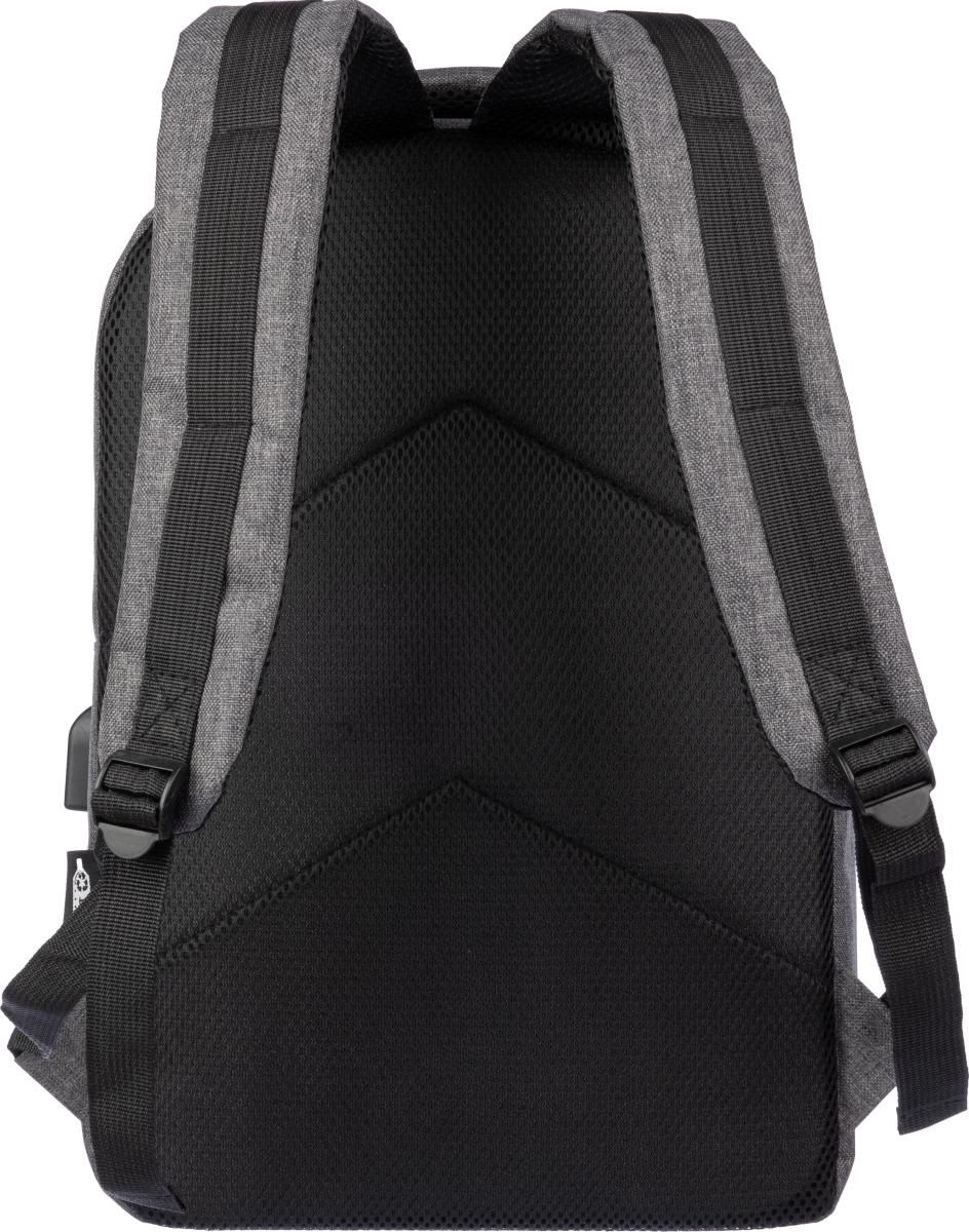 Mochila de rPET (600D) con puerto USB (y cable USB en el interior). Tiene un gran compartimento con cremallera en la parte superior y un bolsillo con cremallera en la parte delantera. En el interior, hay un compartimento para dispositivos de 10’’ y otro para dispositivos de 15’’. Correas ajustables.