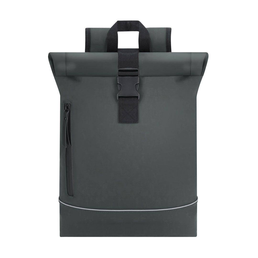 Mochila confeccionada en suave y resistente PU diseñada con tira reflectante en el frontal para mayor visibilidad. Con sistema de cierre enrollable con cremallera y hebilla ajustable. Interior de gran capacidad con compartimento interior acolchado para portátil de hasta 15 pulgadas. Dispone de un bolsillo frontal resistente al agua y cintas de hombros en PU y espalda acolchada para mayor comodidad. Incluye cinta trasera para ajuste en trolley o maleta, ideal para viajes y desplazamientos.