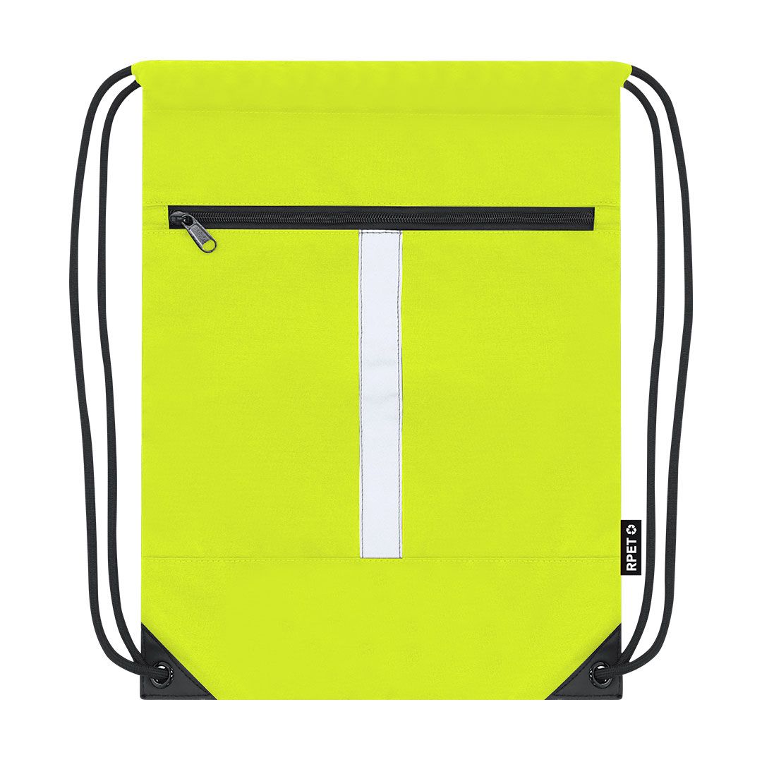 Mochila reflectante en Poliéster 300 RPET, con tira frontal reflectante. Cuenta con bolsillo en parte frontal. Cuerdas autocierre en color negro y esquinas reforzadas con argollas metálicas.