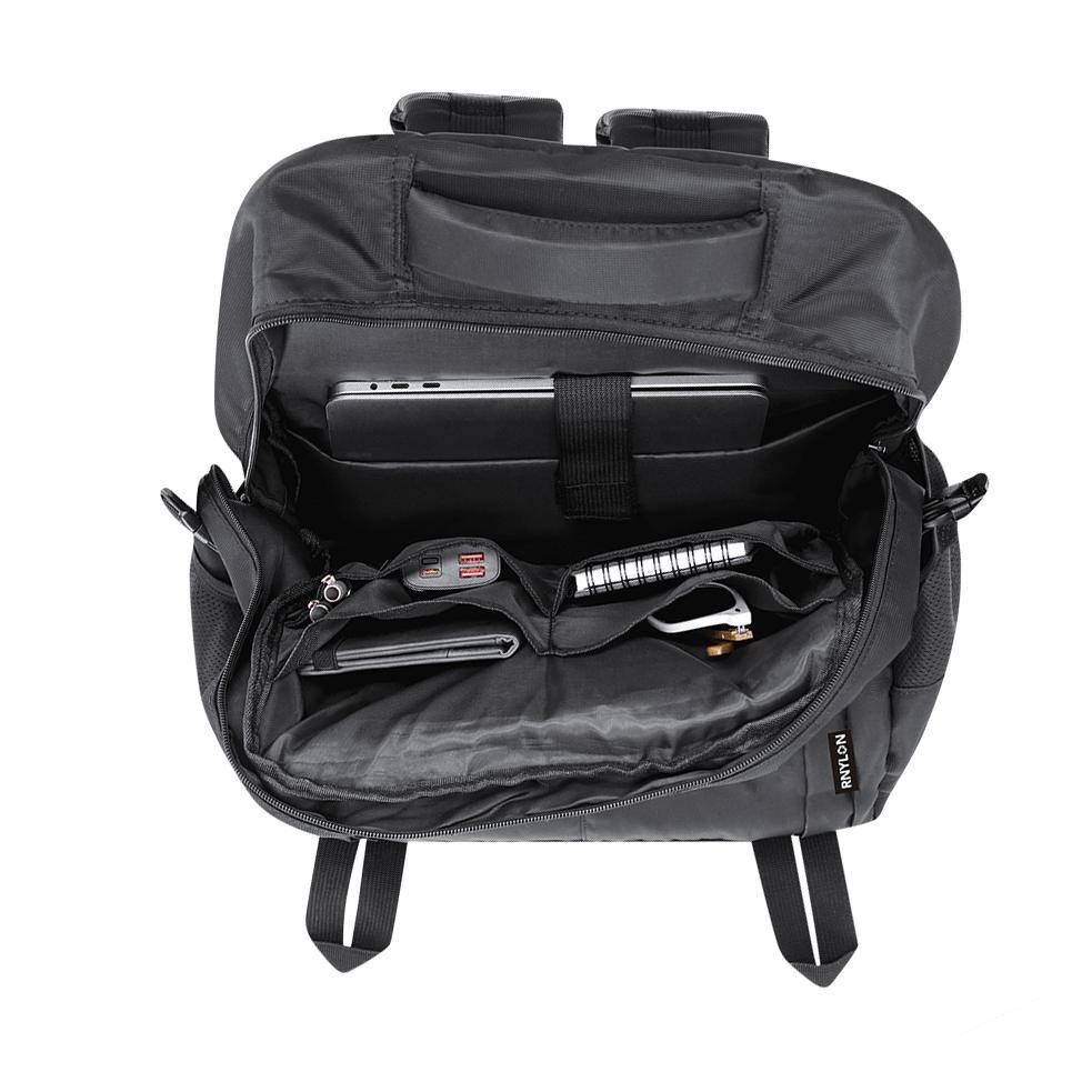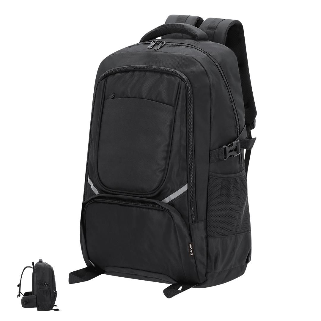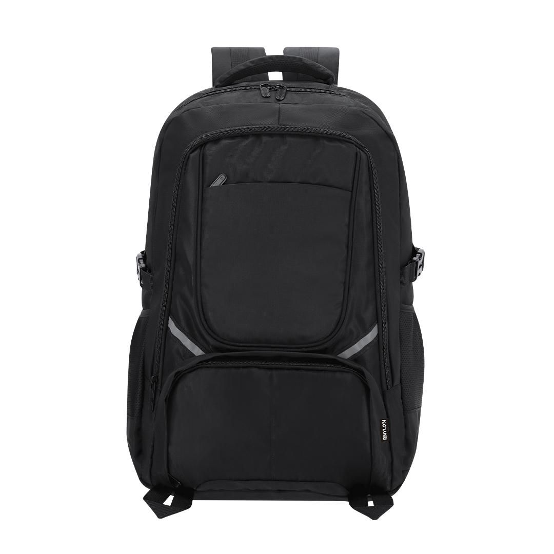 Mochila fabricada en Nylon Reciclado 420D. Con bolsillo principal de cierre de cremallera con doble tirador. Bolsillos de malla laterales y cintas de hebilla ajustables Bolsillo interior para portátil de hasta 15 pulgadas. Incluye dos bolsillos frontales con cierre de cremallera y cintas reflectantes. Espalda y cintas acolchadas ajustables, con hebilla de cierre en el pecho para mayor sujeción.