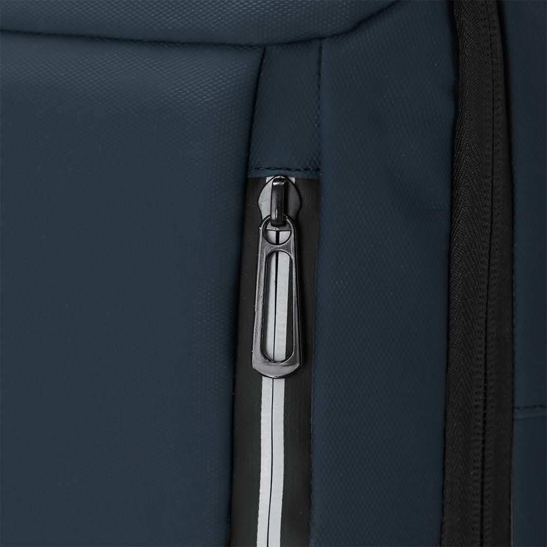 Mochila extensible confeccionada en resistente PU. Equipada con cierre de cremallera de doble tirador, con posibilidad para ampliar la capacidad. Con compartimento interior acolchado para portátil de hasta 15 pulgadas y tablet de hasta 10". En la parte frontal cuenta con tres bolsillos frontales y dos tiras reflectantes para mejor visibilidad. Cómodas cintas de hombros acolchadas, transpirables y ajustables, con posibilidad de cierre en hebilla. Incluye dos asas una en la parte superior y otra en el lateral junto con entrada USB. Incluye cinta para fijarla en trolley y maletas.