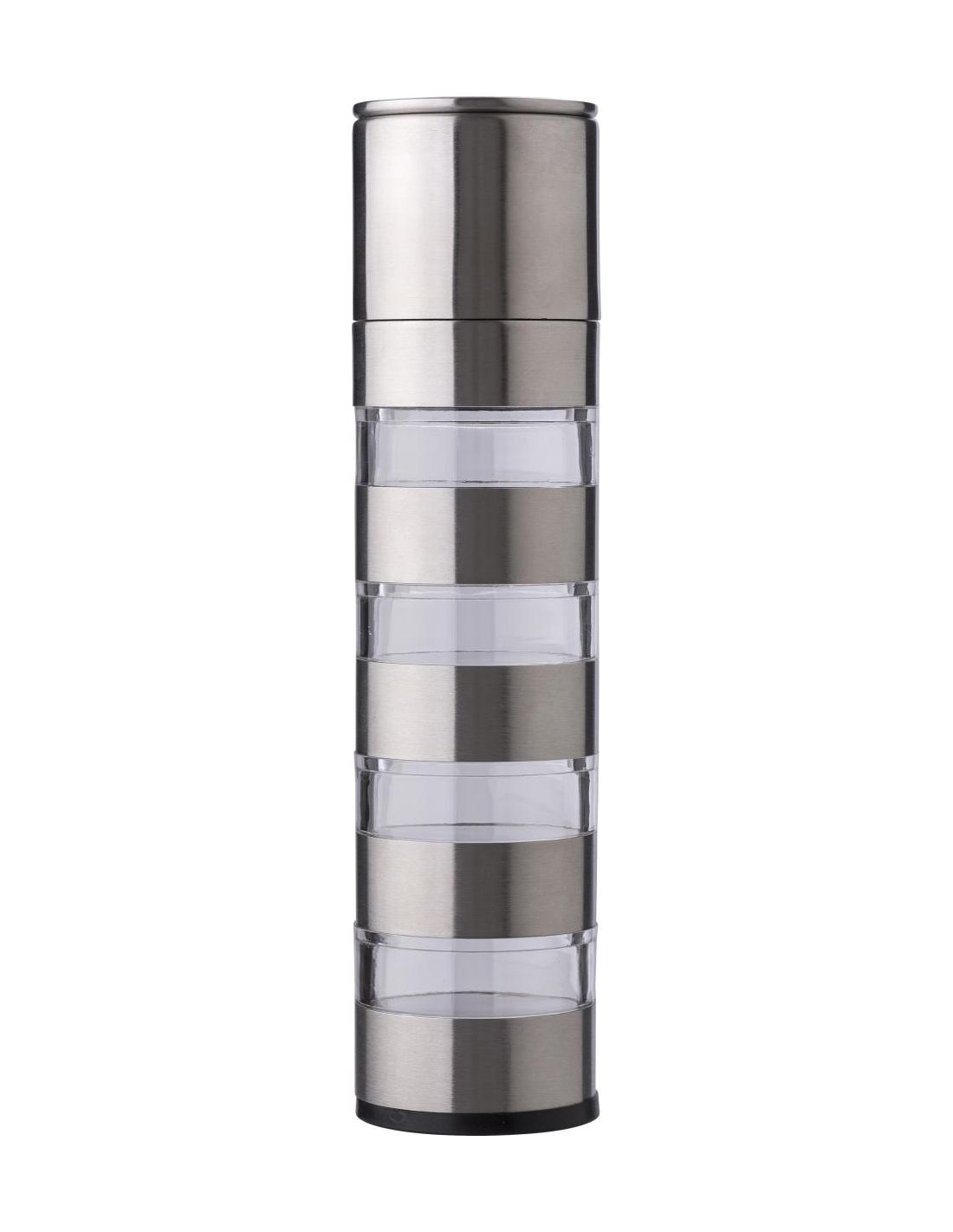 Recipiente para especias de acero inoxidable con 4 compartimentos y molinillo de cerámica. Solo necesitas enroscar arriba el contenedor con la especie que quieres en cada momento y molinar. Presentado en una caja de cartón marrón.