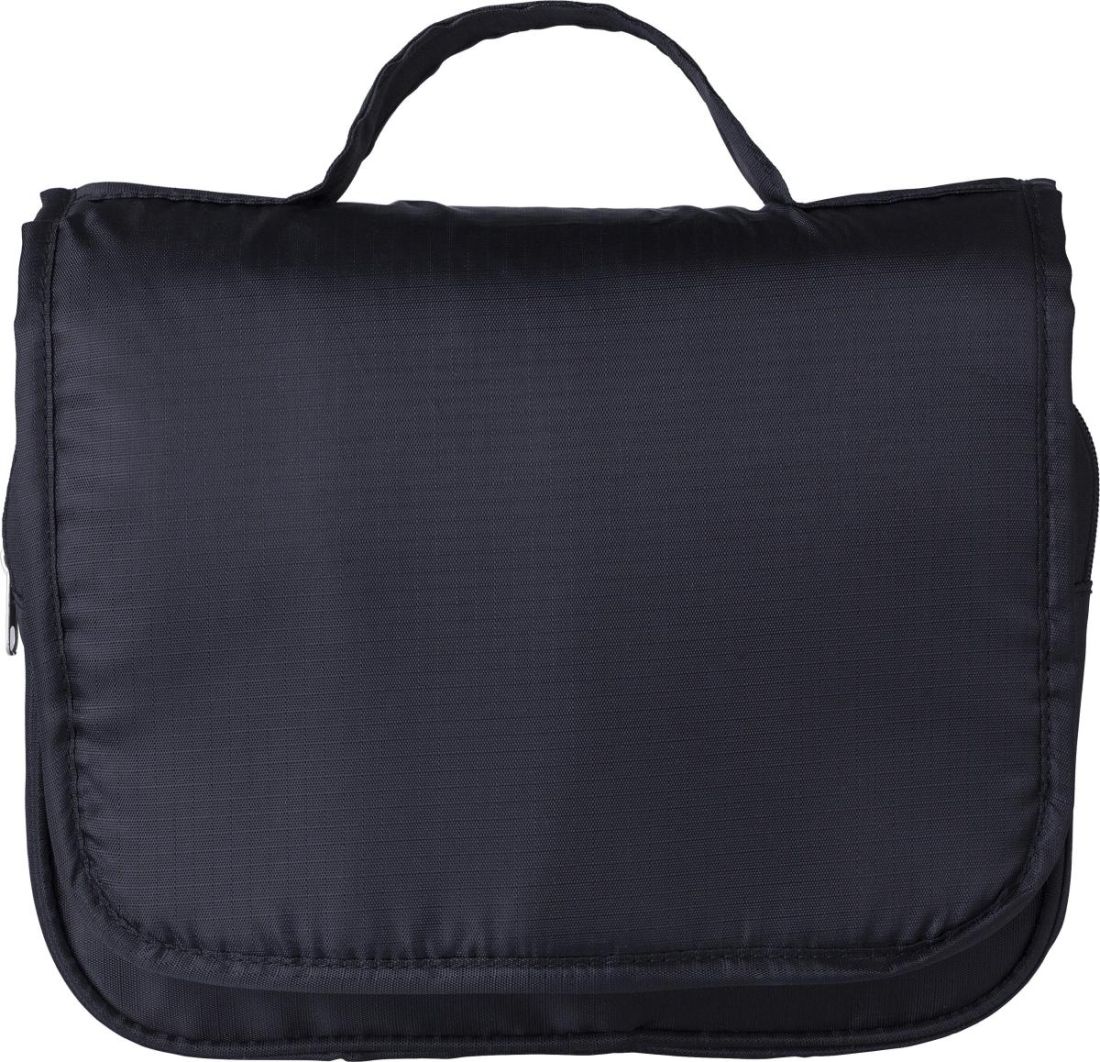 Neceser de viaje de poliéster (210D) ripstop con gancho para colgar. Bolsa con cremallera en la parte superior cuando se abre. Un bolsillo de malla grande y uno pequeño con cremallera, otro bolsillo detrás y asa corta.