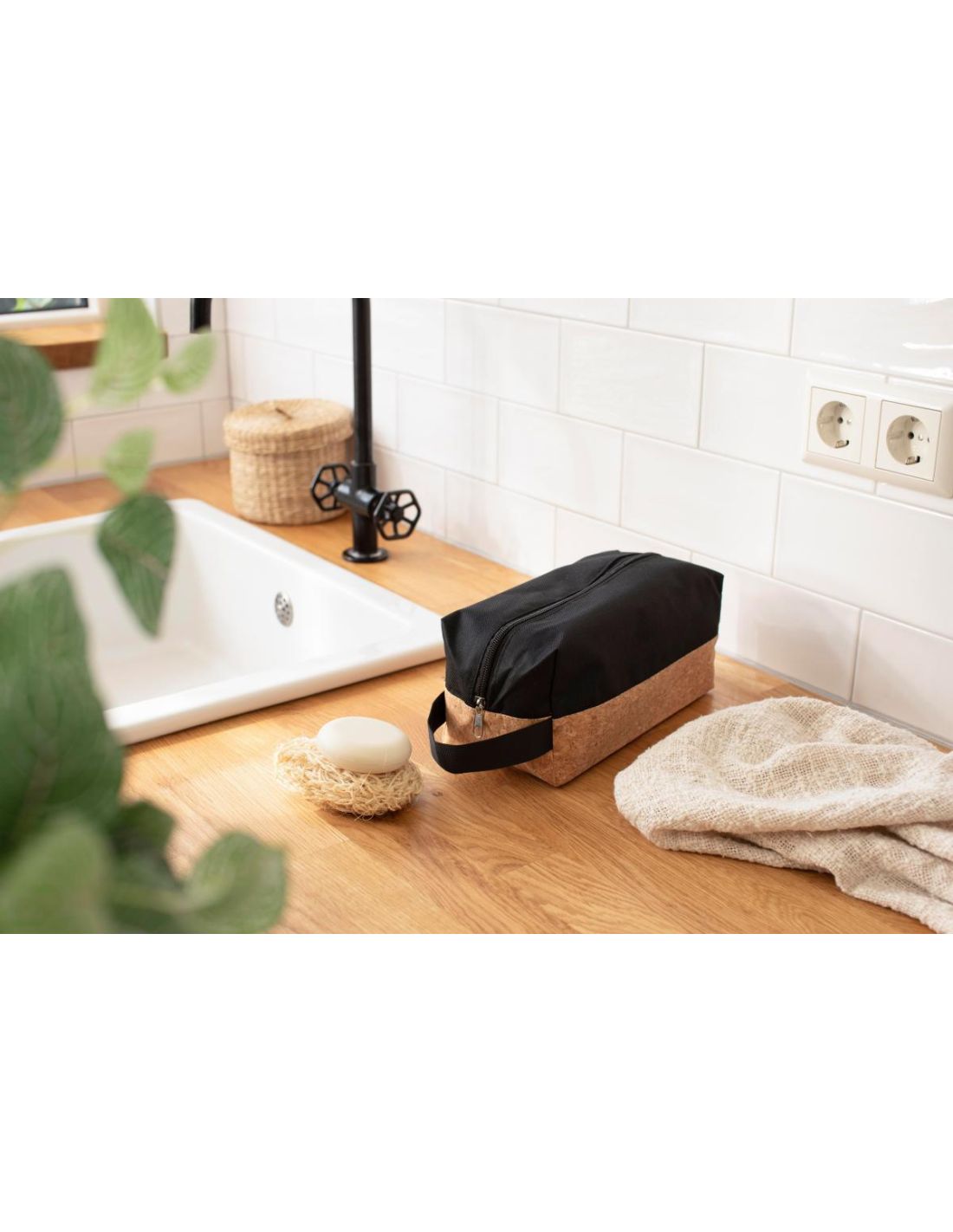 Neceser de poliéster (600D) y corcho con cremallera y asa de mano.