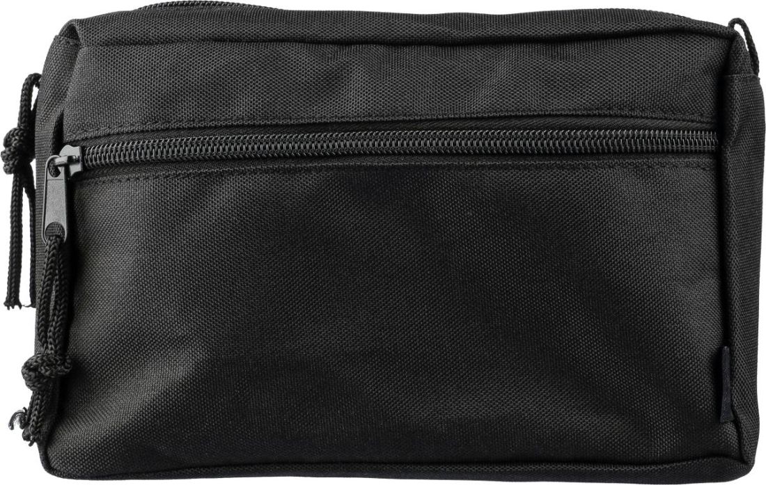 Neceser de rPET con compartimento principal y bolsillo frontal, ambos con cremallera y tiradores.