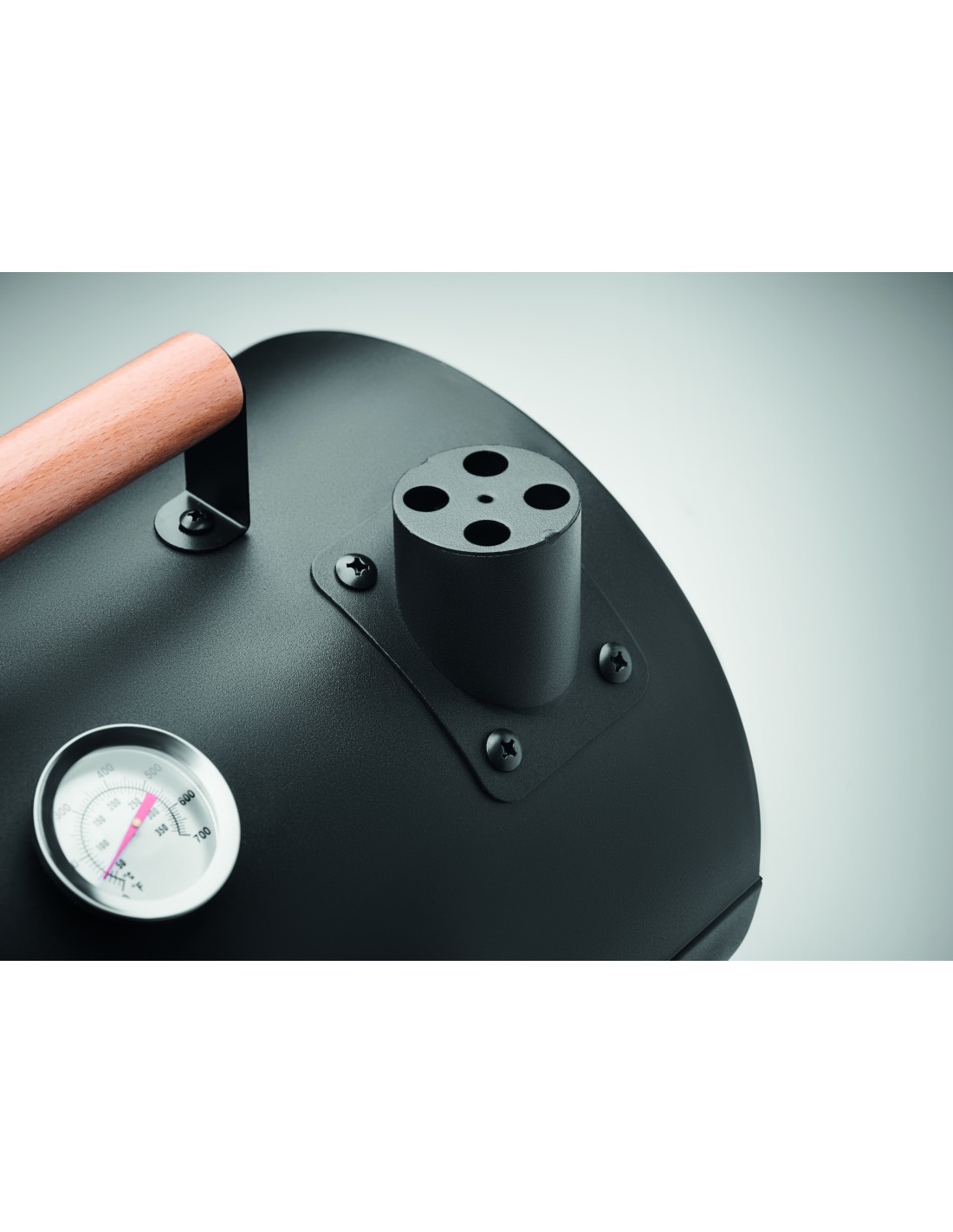 Barbacoa portátil de hierro con chimenea y medidor de temperatura. Resistente al calor. Con cierre y asa de madera.